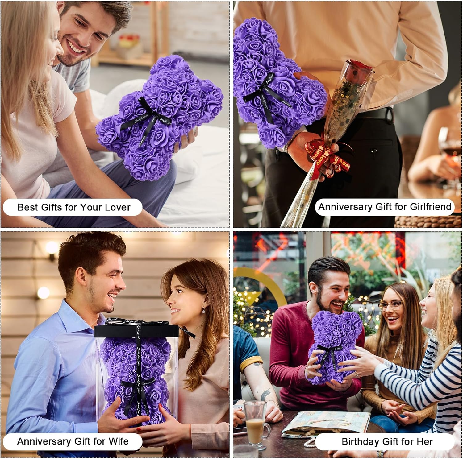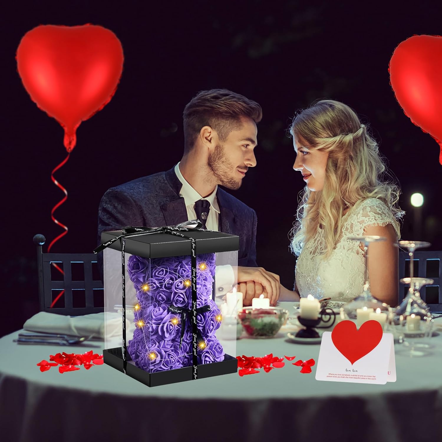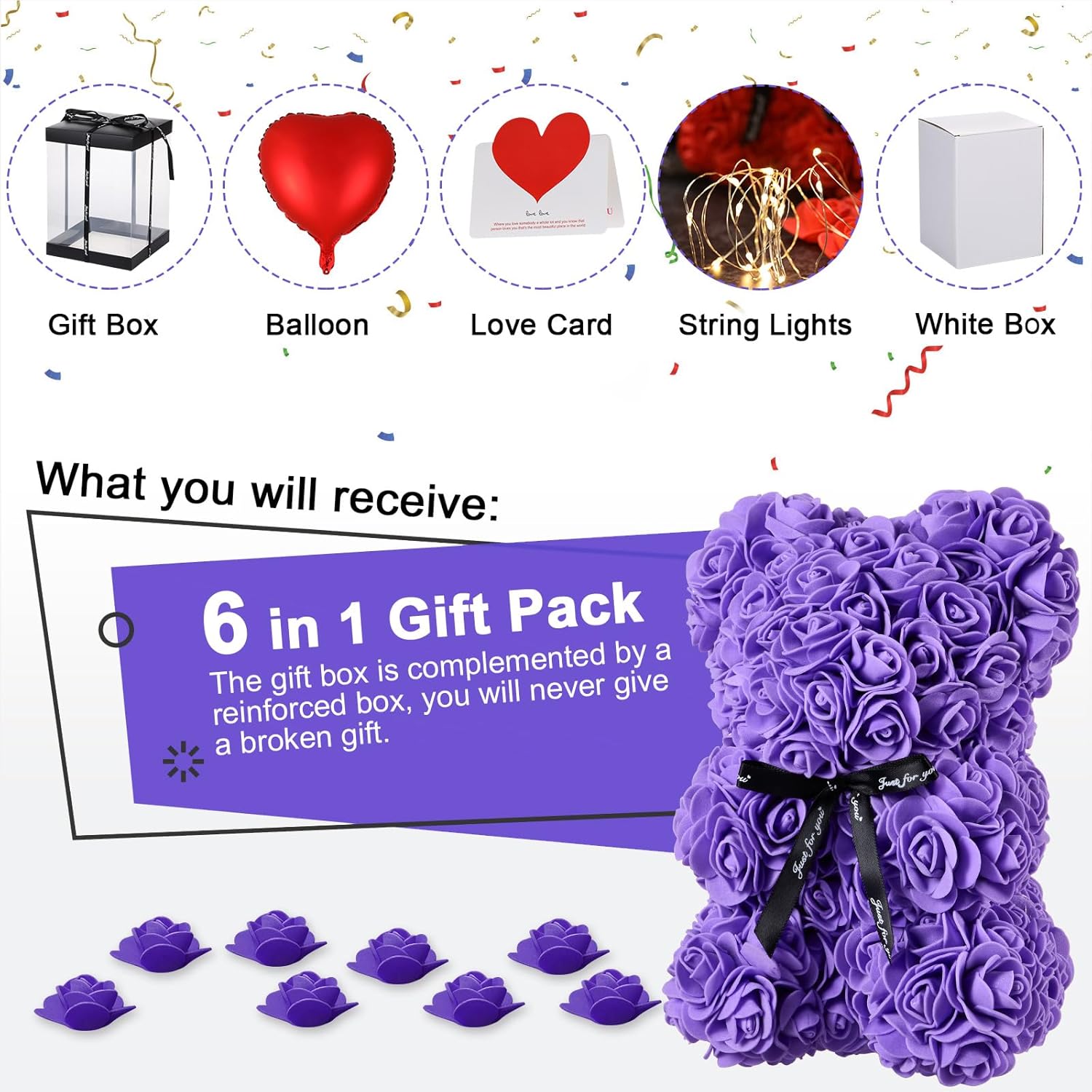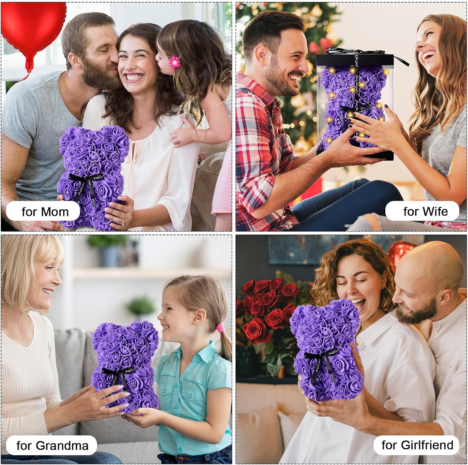 Rose bear - gifts for her - rose flower bear roses teddy bear with lights - over 250 flowers on each rose bear - gift for Mother's Day, Valentine's Day, anniversary with gift box and love card? Valentine's Day gift for women – do you find it difficult to choose Valentine's Day gift for her? Come and see it! Now here is the perfect 4-in-1 gift set for you, the 1 x rose bear + 1 x gift box + 1 x loving card + 1 x shiny decoration. We believe that this rose bear gift set will meet all your expectations. ? Handmade – As a new representative in the world of teddy bears, the flower teddy bear is different from other teddy bears, made from artificial flowers modelled on rose petals. As the rose bear is handmade, one or two flowers may come off the glue and fall off after a long transport time. If it happens, you can take some glue and stick it. ? Ready gift packaging – Each bear comes in a clear gift box as shown in the main picture. It can display its graceful symbol in a transparent gift box, and girls love bears made of roses. Besides, writing with a love card can express your sincerity. And we add a white sturdy packaging box outside the transparent gift box, you will not receive damaged rose bears and the gift. ? Dimensions: rose flower bear is 25 cm. Faux Silk Rose Flower Bear - As rose petals "b" forever, you can put them on the shelf or table and it will always be that sweet reminder of love. Also add a red balloon and LED light as gift decoration, we believe that all together will meet your expectations.