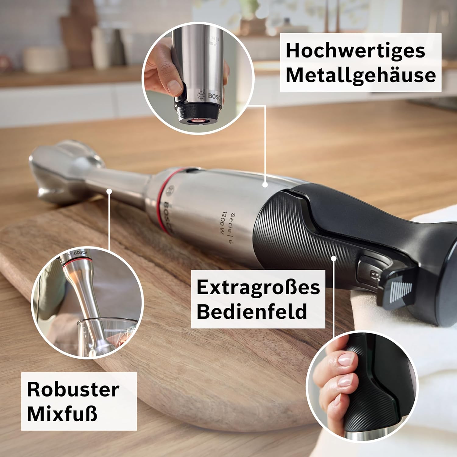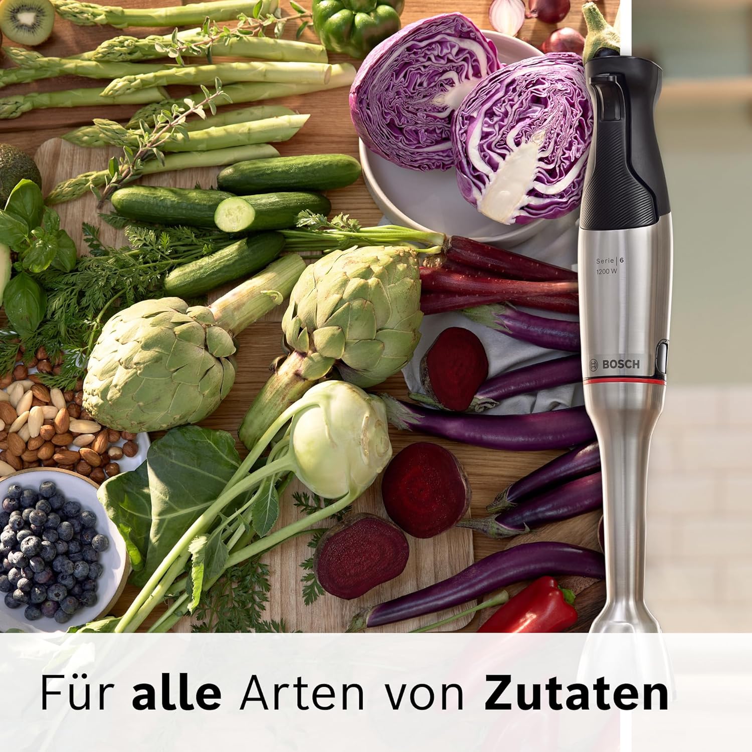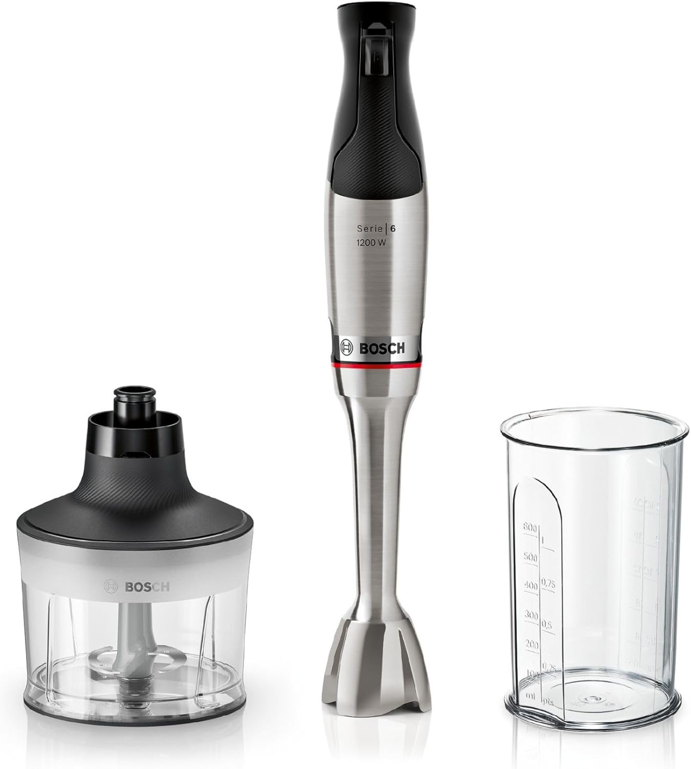 Ръчен блендер Bosch ErgoMaster Series 6, чопър, работа с една ръка, 4 ножа от неръждаема стомана, керамична връзка без износване, въздушно охлаждане, издръжлив, чаша за смесване, мощен, 1200 W, MSM6M830