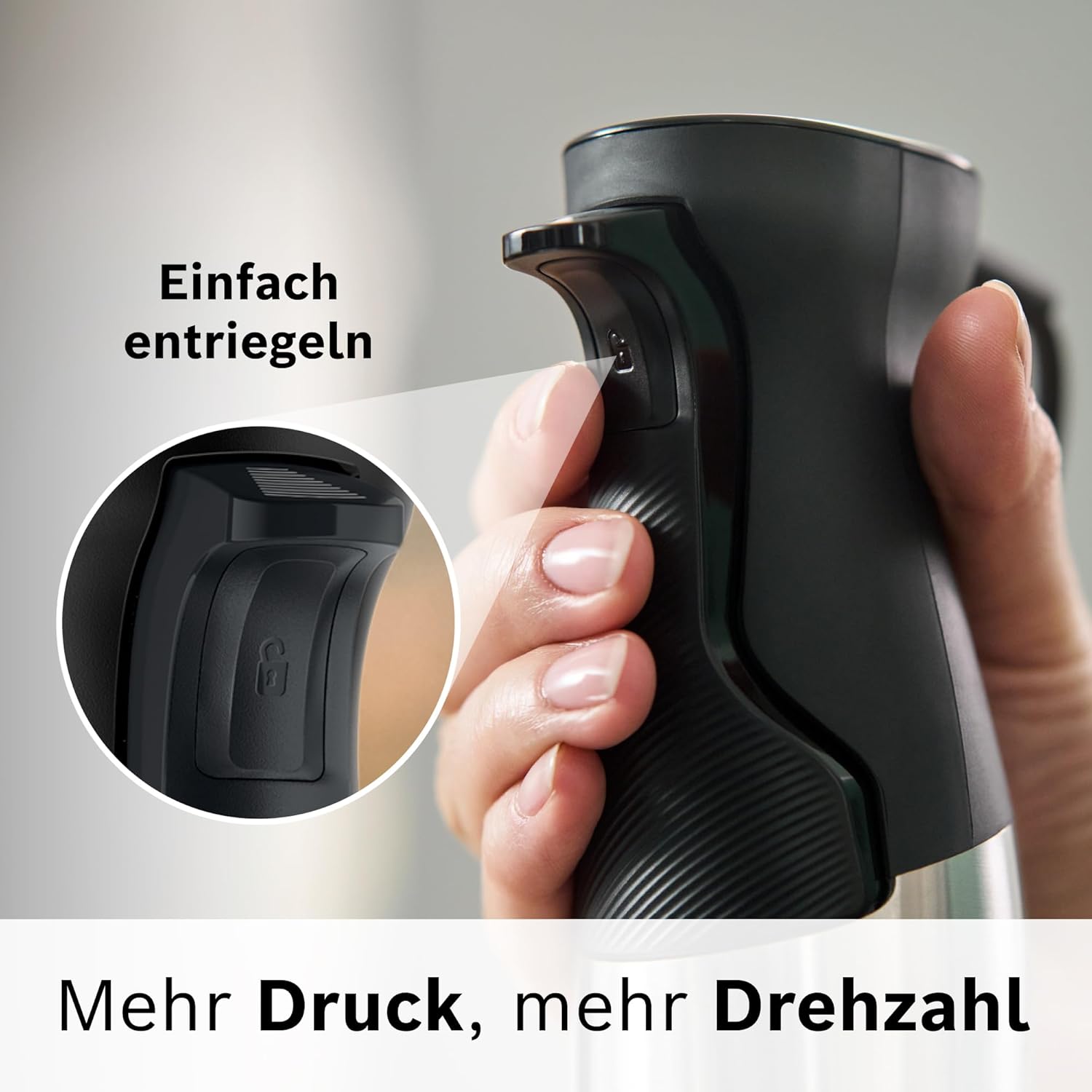 • Безпроблемно смесване: скоростта може да се контролира интуитивно чрез изключително големия бутон за управление - колкото по-силно е налягането, толкова по-висока е производителността на смесване