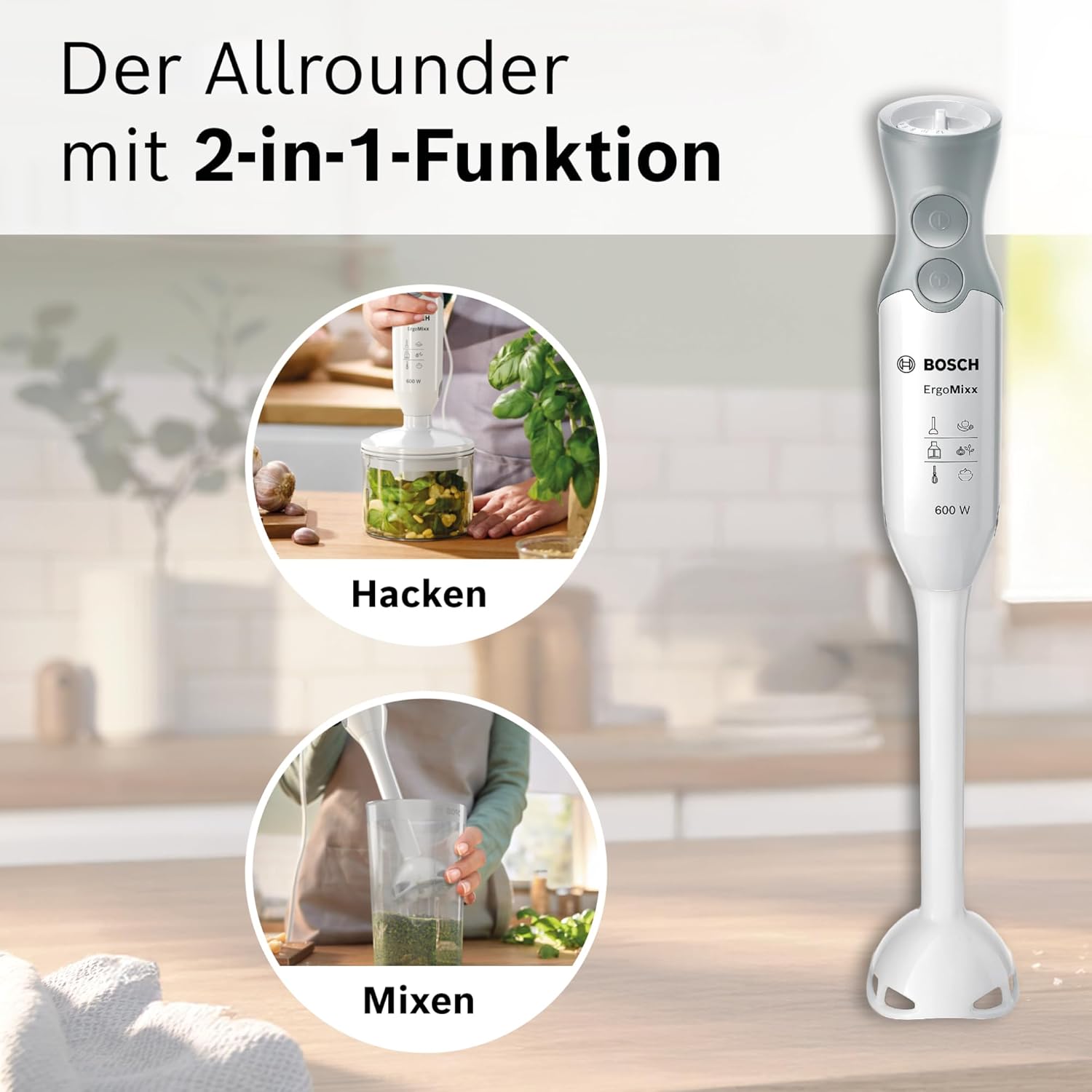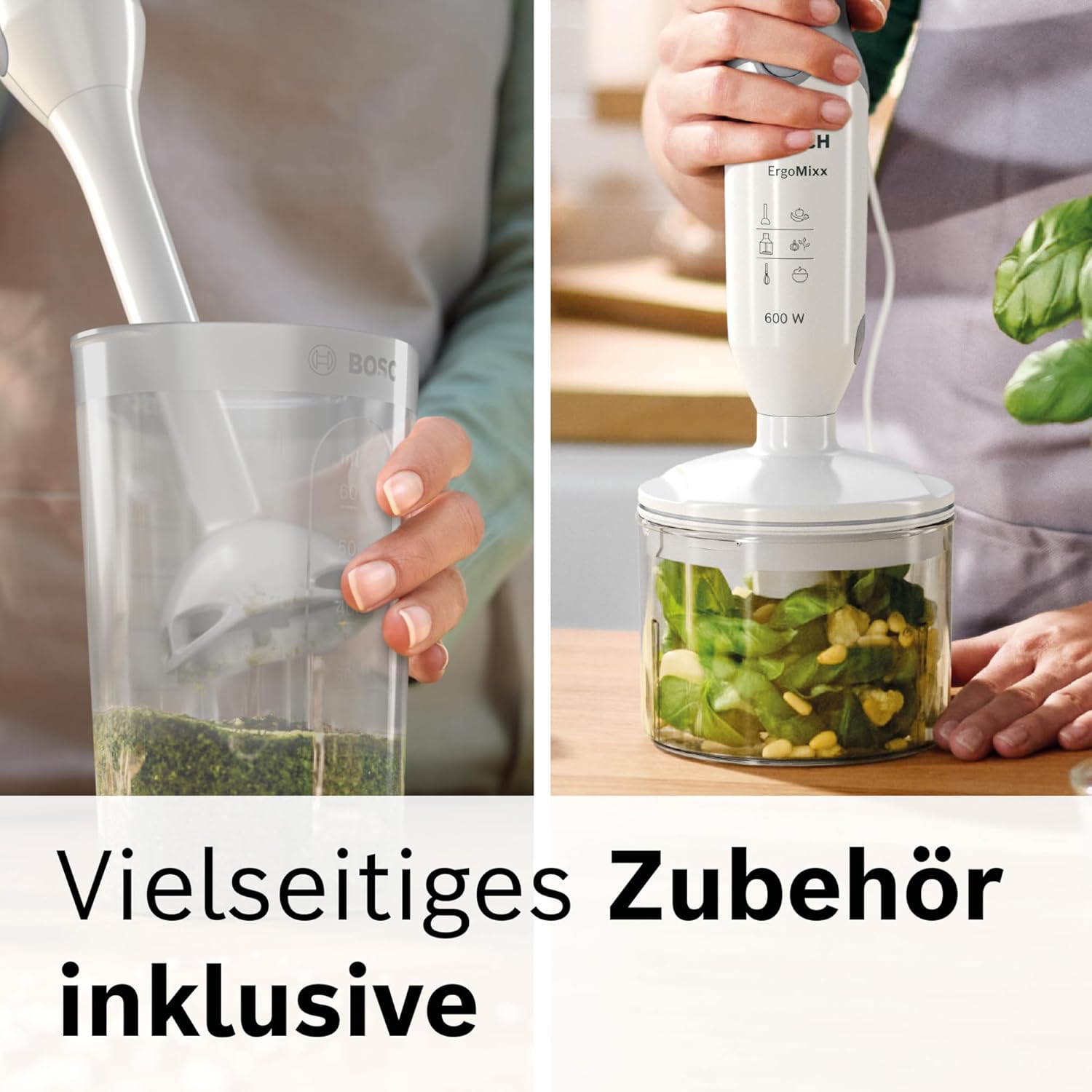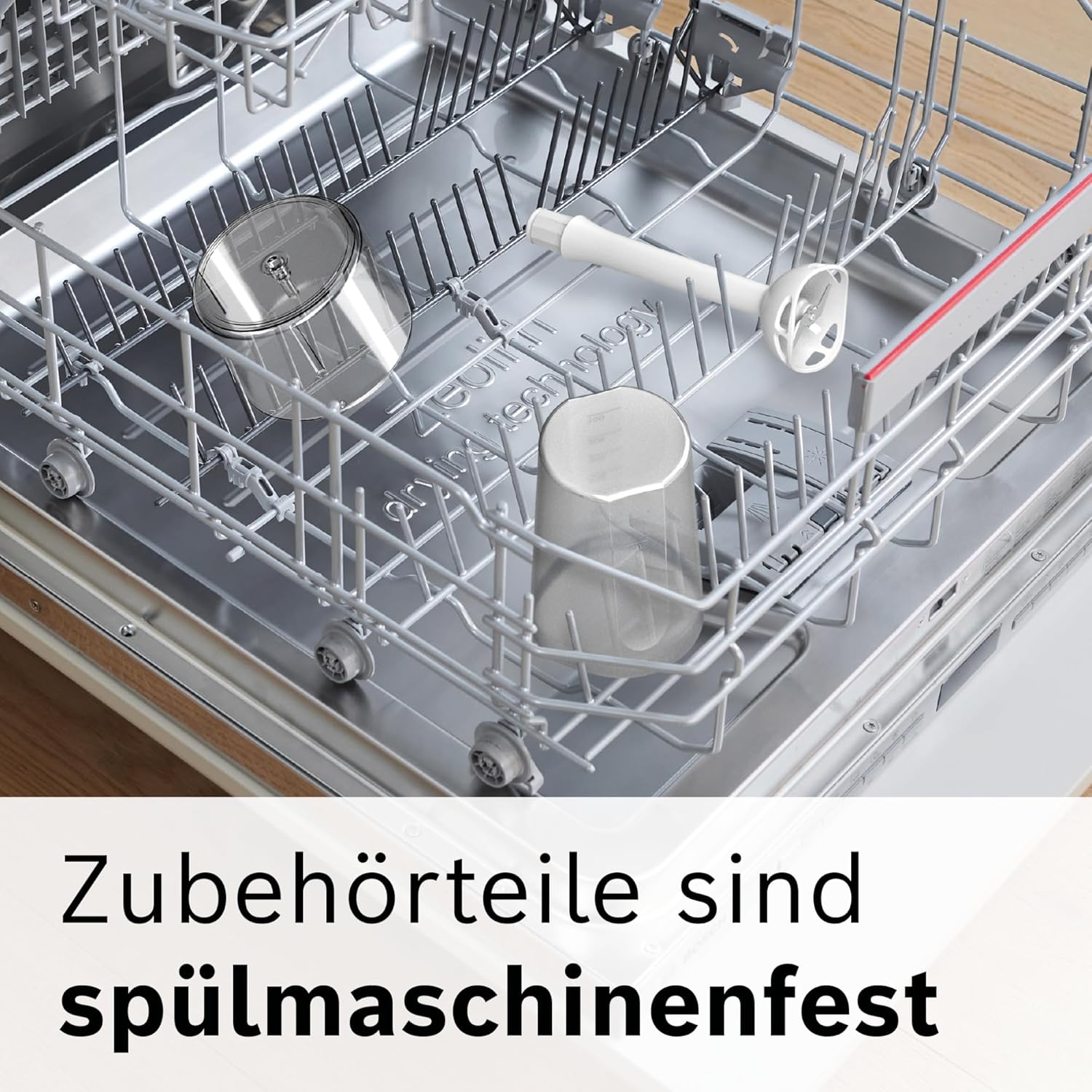 • Съдържание на кутията: 1 x ръчен пасатор Bosch ErgoMixx от неръждаема стомана, 2 x капака, 1 x шейкър/чаша, 1 x ръчен миксер, 1 x универсален чопър/миксер със 750 вата, цвят: черно/сив