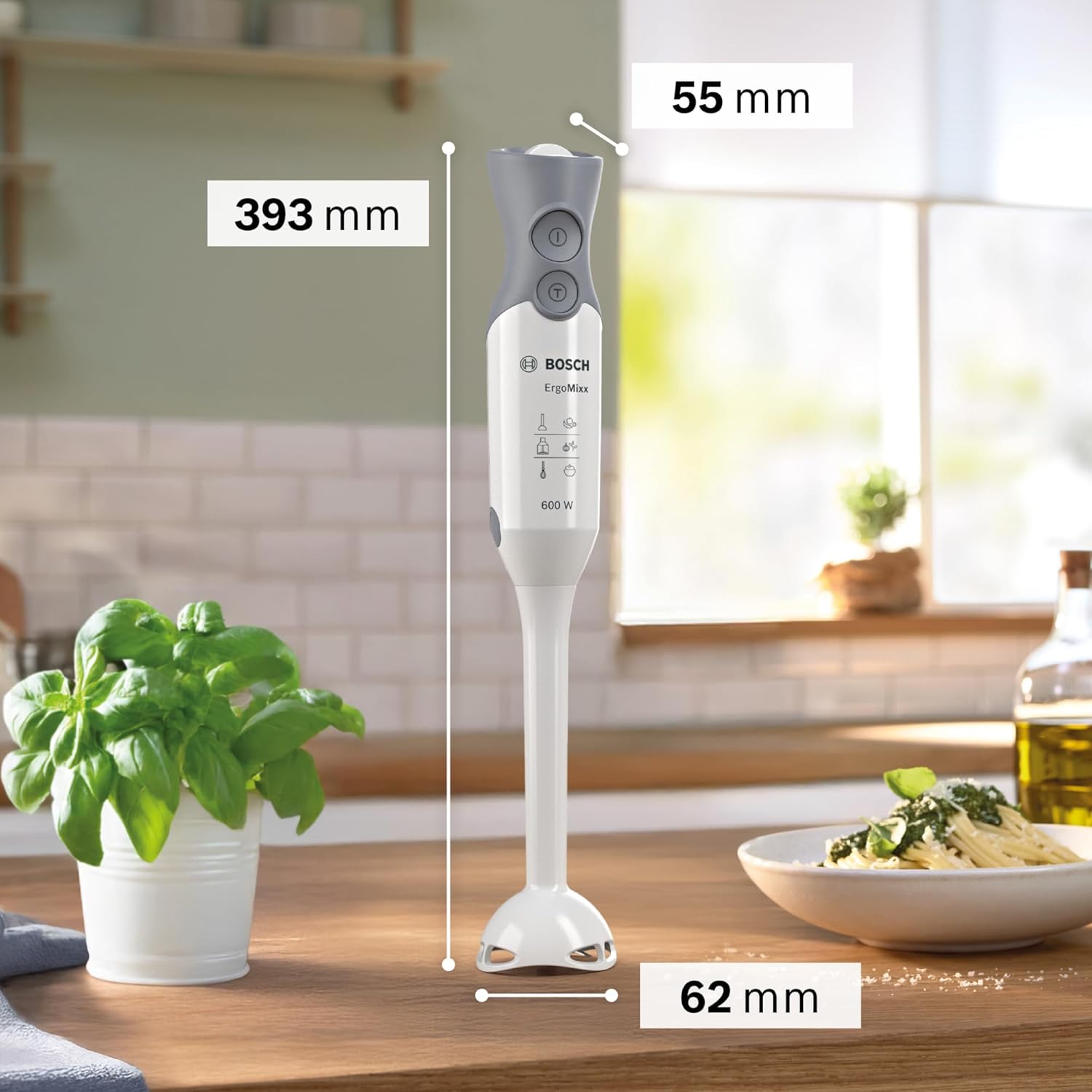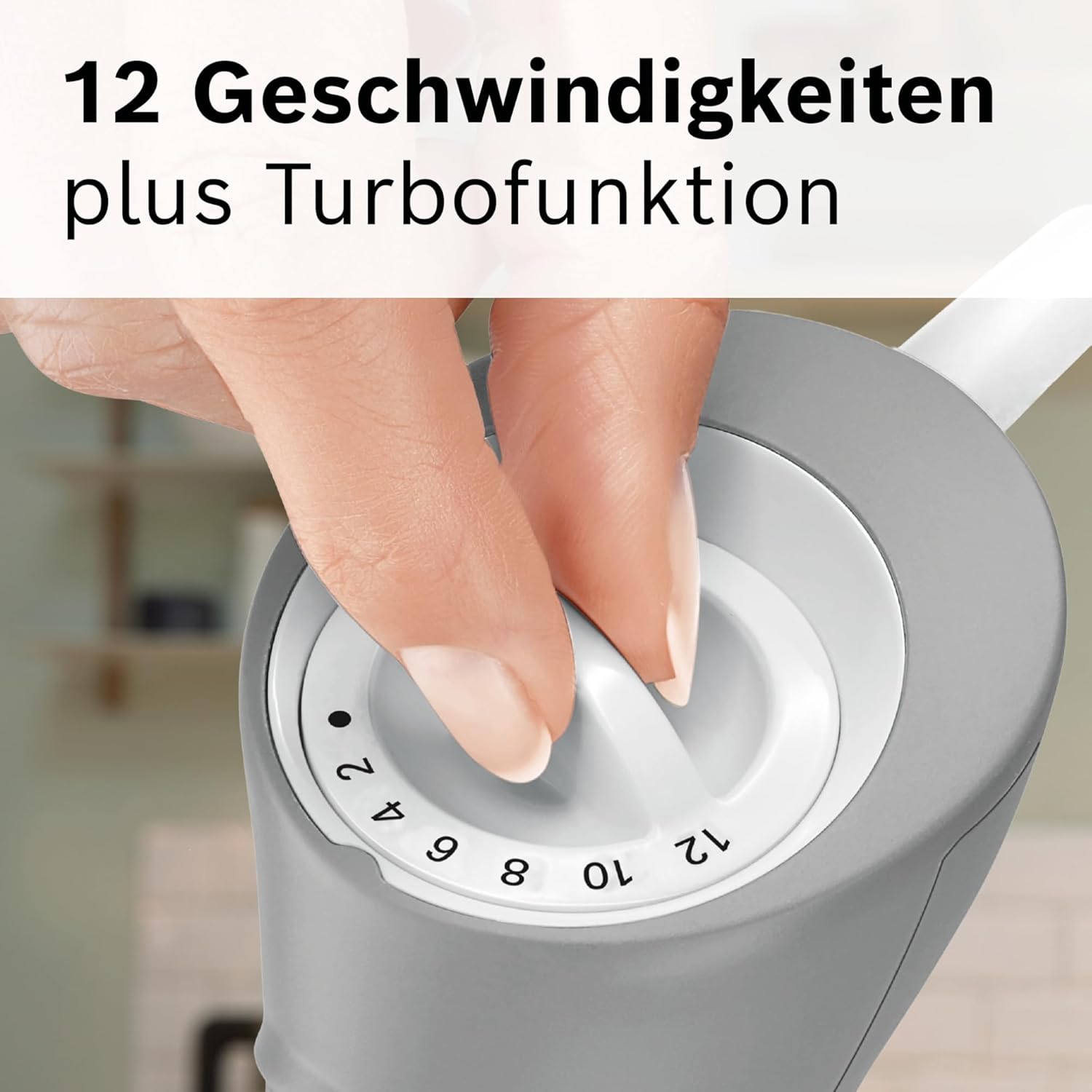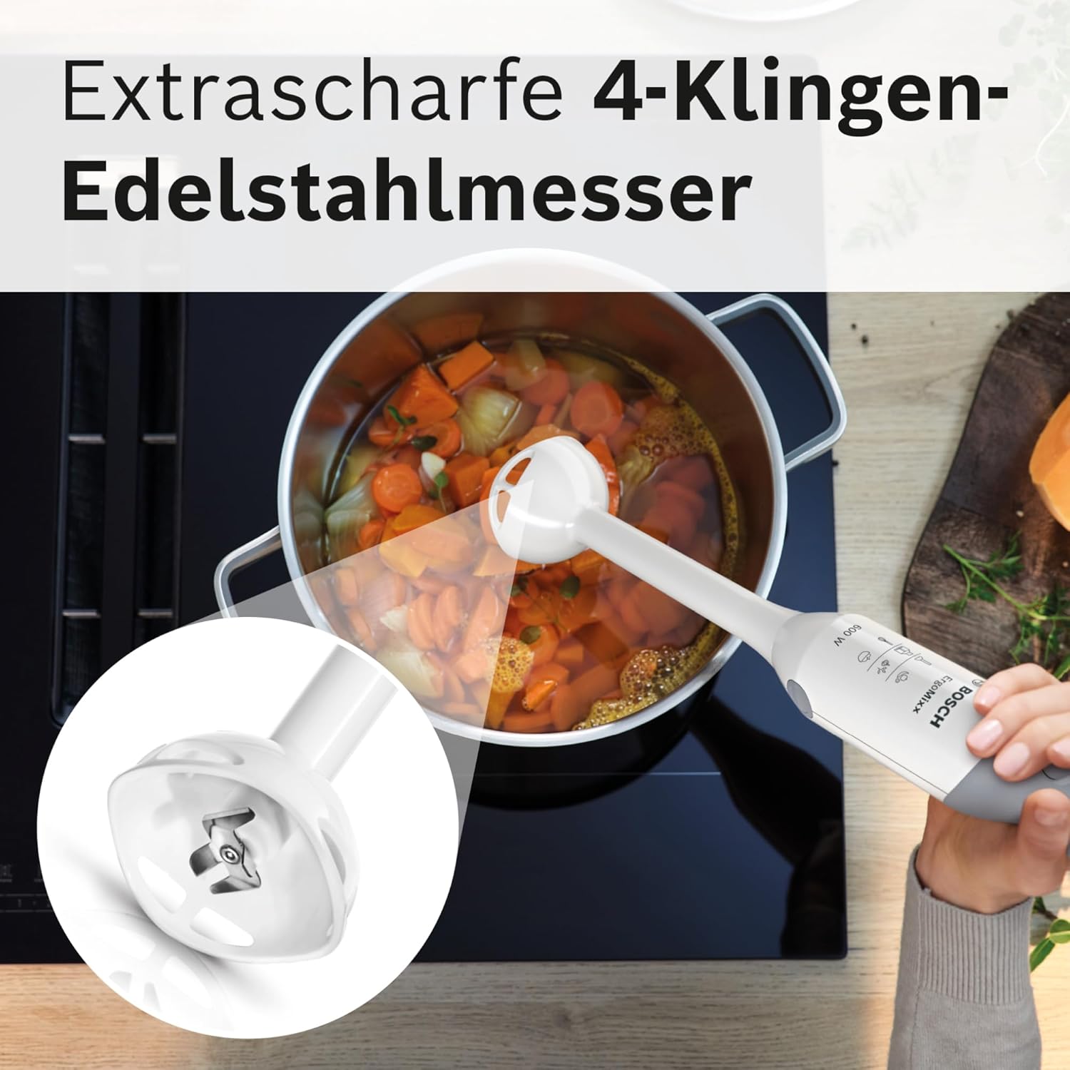 • Съдържание на кутията: 1 x ръчен пасатор Bosch ErgoMixx от неръждаема стомана, 2 x капака, 1 x шейкър/чаша, 1 x ръчен миксер, 1 x универсален чопър/миксер със 750 вата, цвят: черно/сив