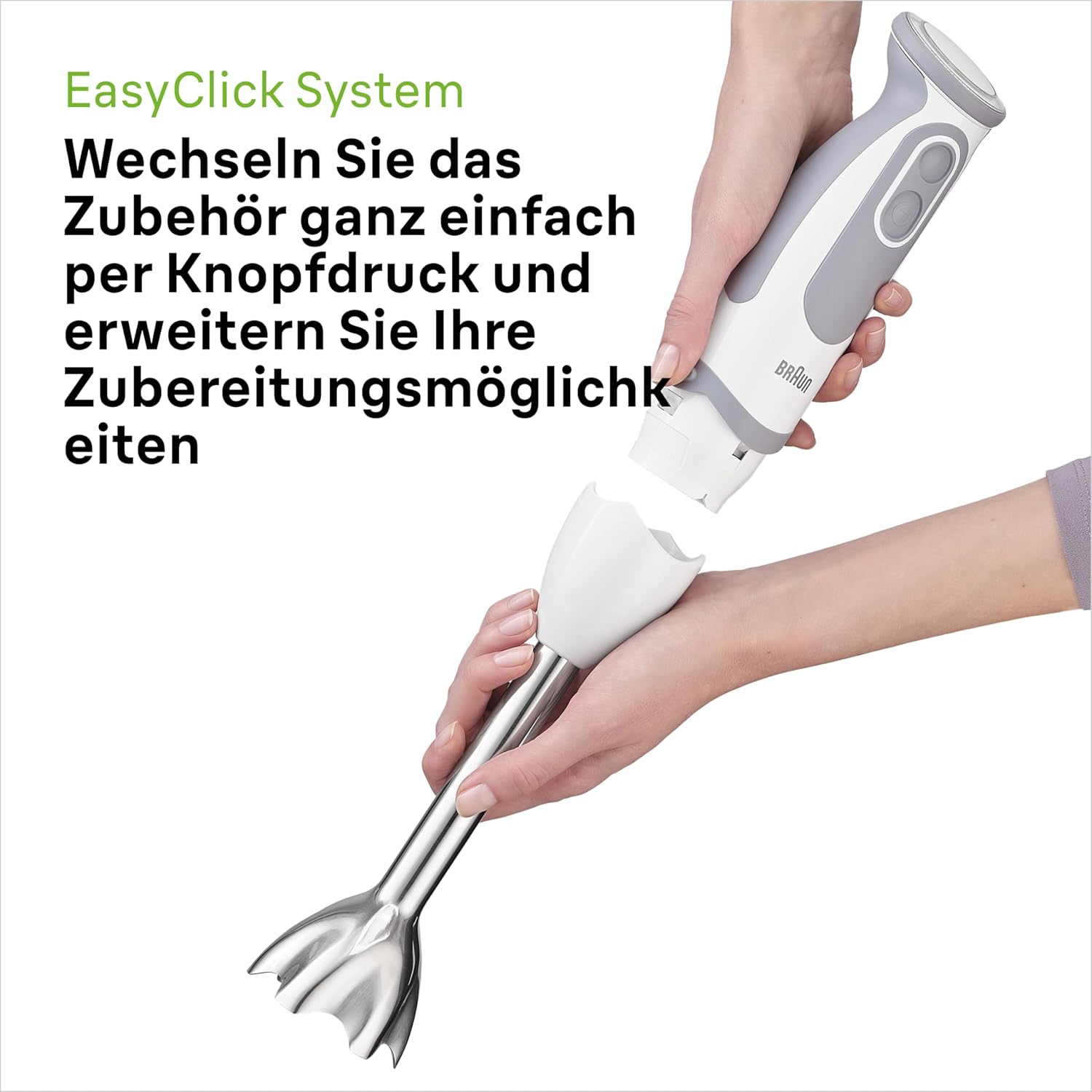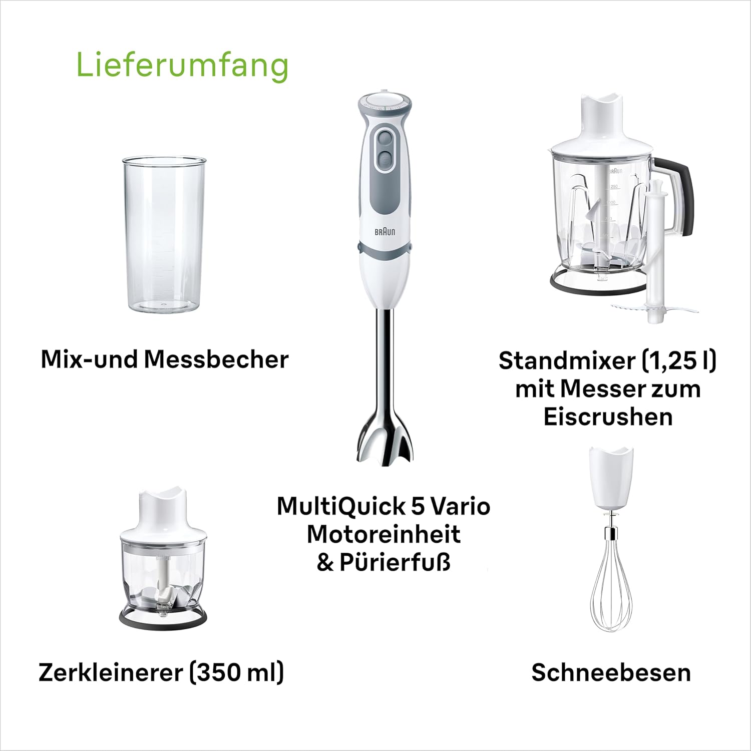 Ръчен блендер Braun MultiQuick 5 Vario MQ 5245WH – пюре с основа от неръждаема стомана, 1000 W, включва комплект от 4 аксесоара, бял/сив