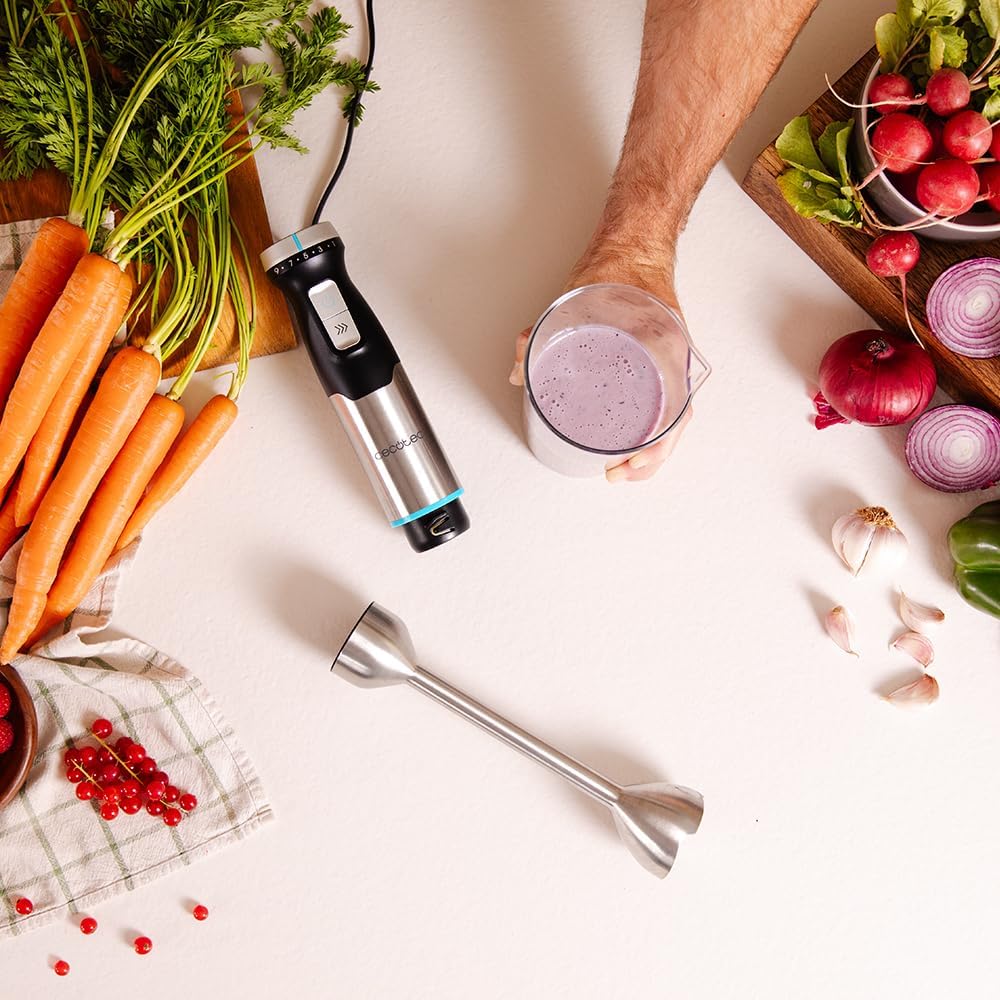 Регулируем контрол на скоростта и турбо функция, която се адаптира с абсолютна прецизност към нуждите на всяка рецепта. Освен това е оборудван с LED индикаторни светлини с интуитивен и привлекателен дизайн.