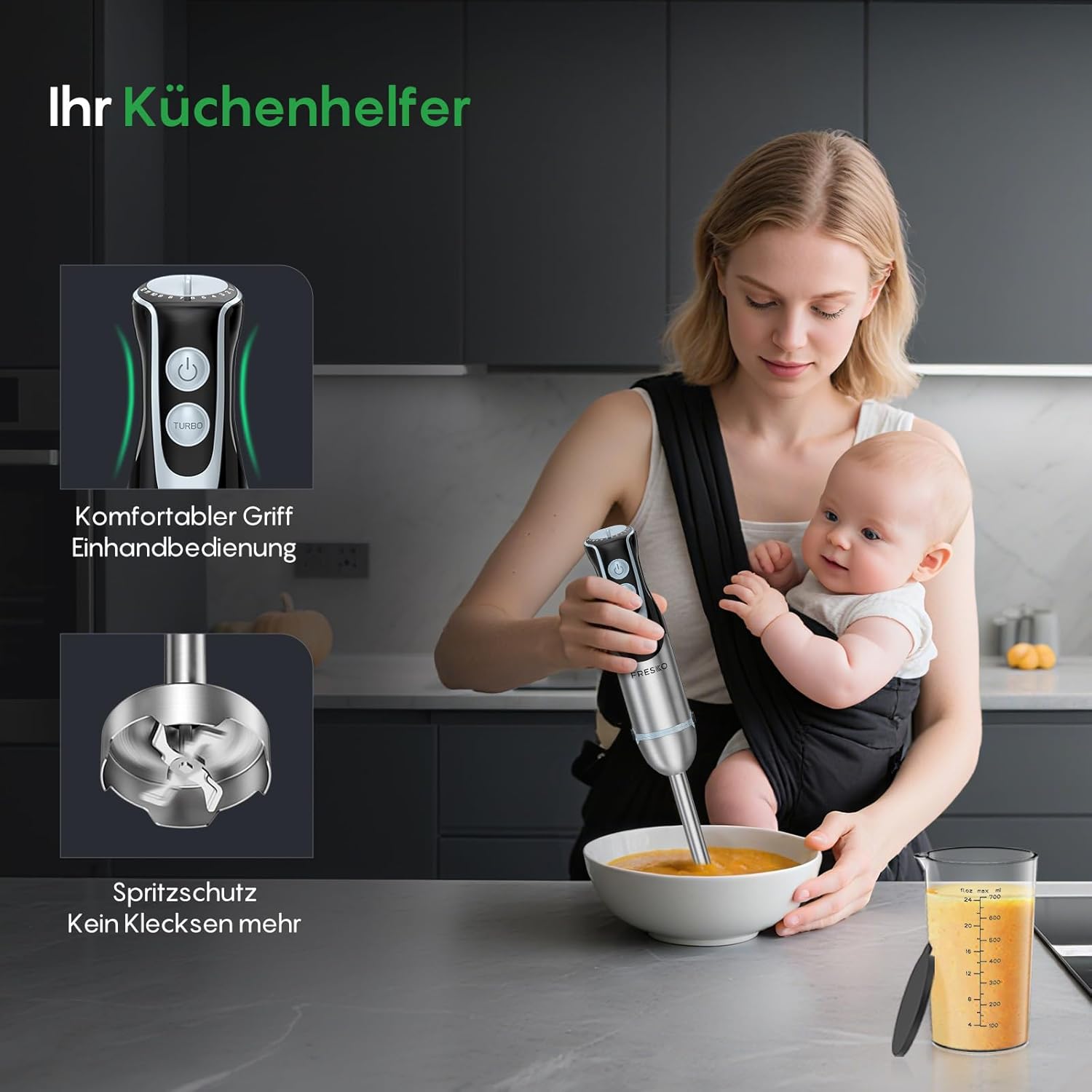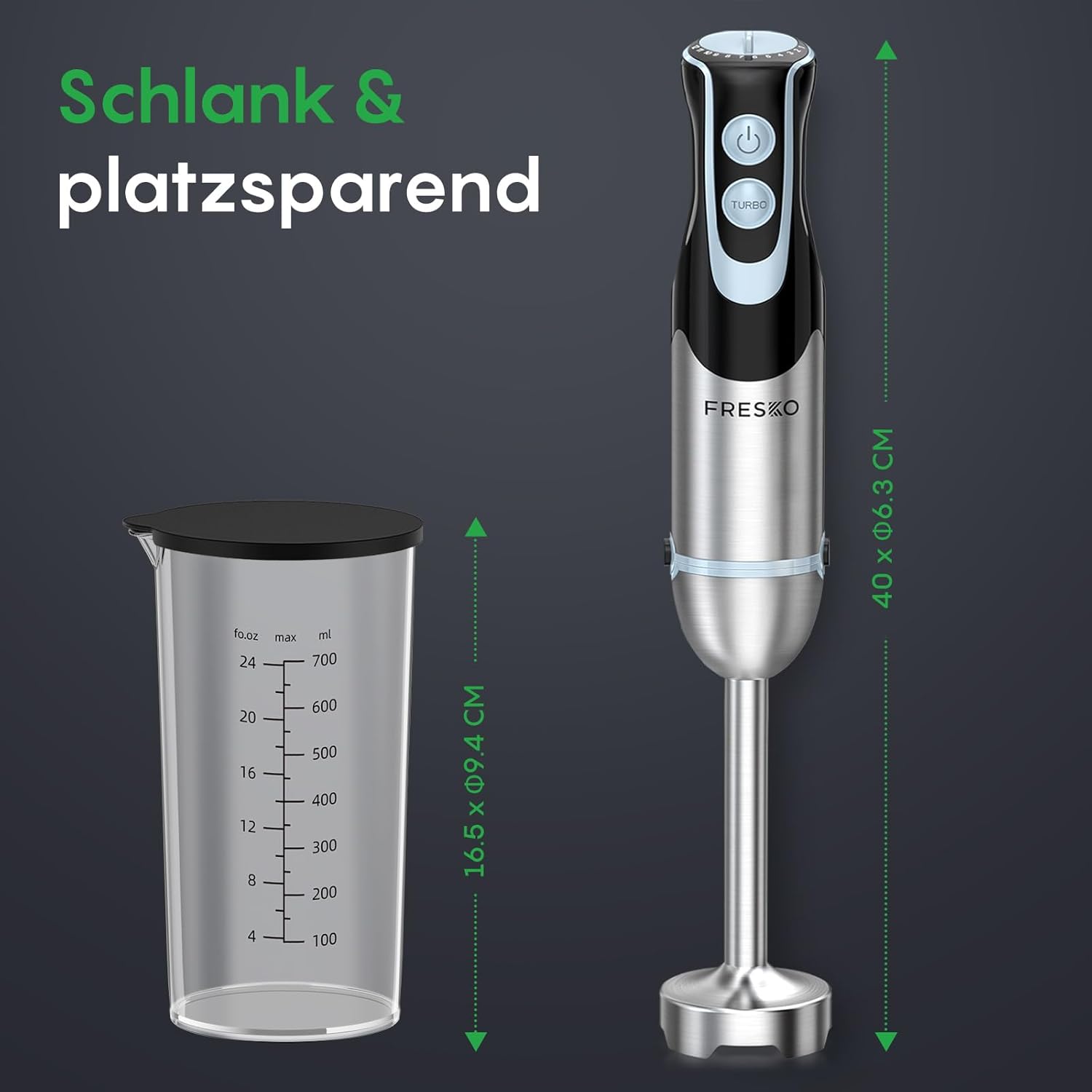 Ръчен блендер FRESKO, 1000 W пюре от неръждаема стомана с 12 нива на скорост, бутон Turbo, чаша 700 мл с капак за приготвяне на сос, бебешка храна и супа