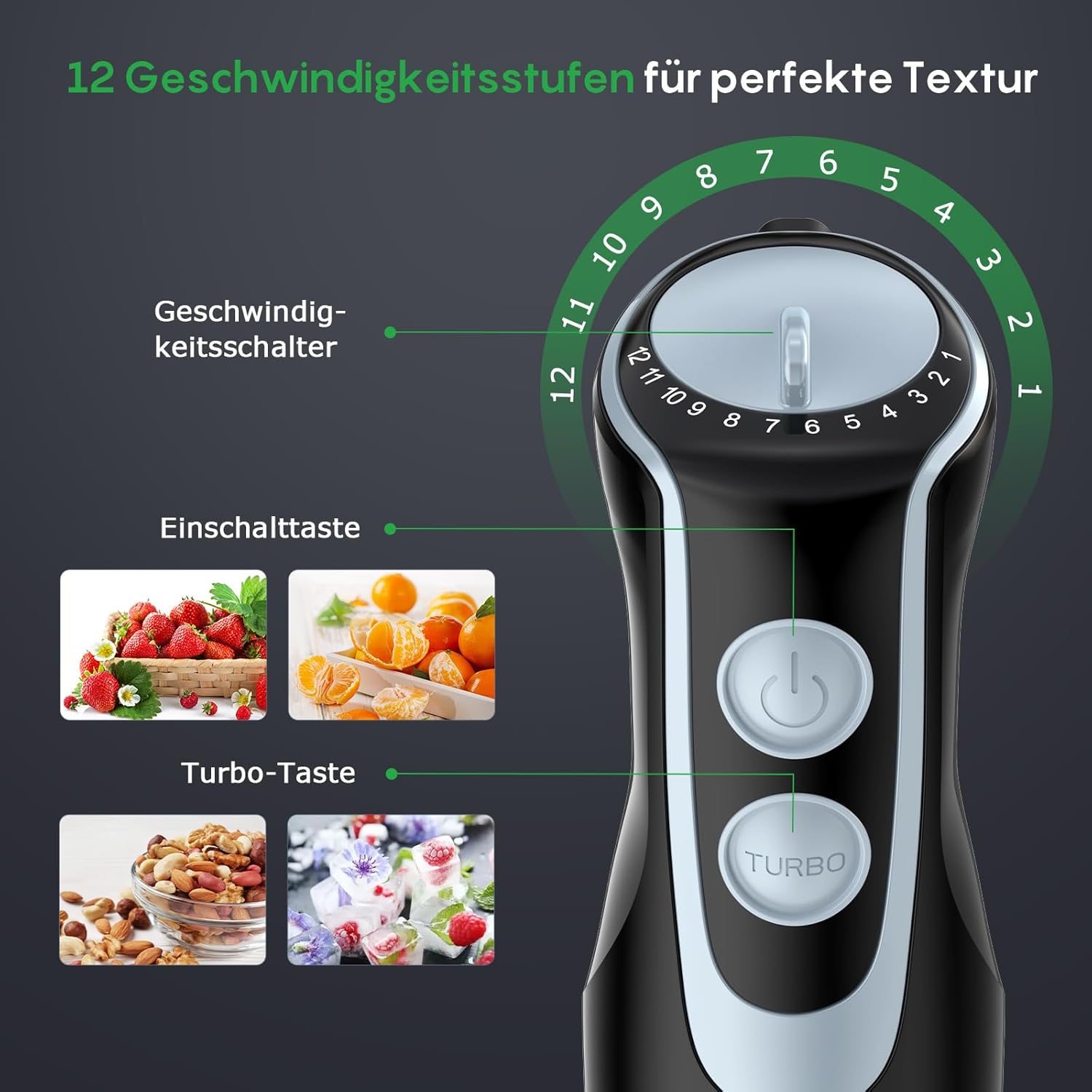 • 2 режима на скорост: турбо зареждане за максимална мощност или 12-степенно регулиране за прецизен контрол