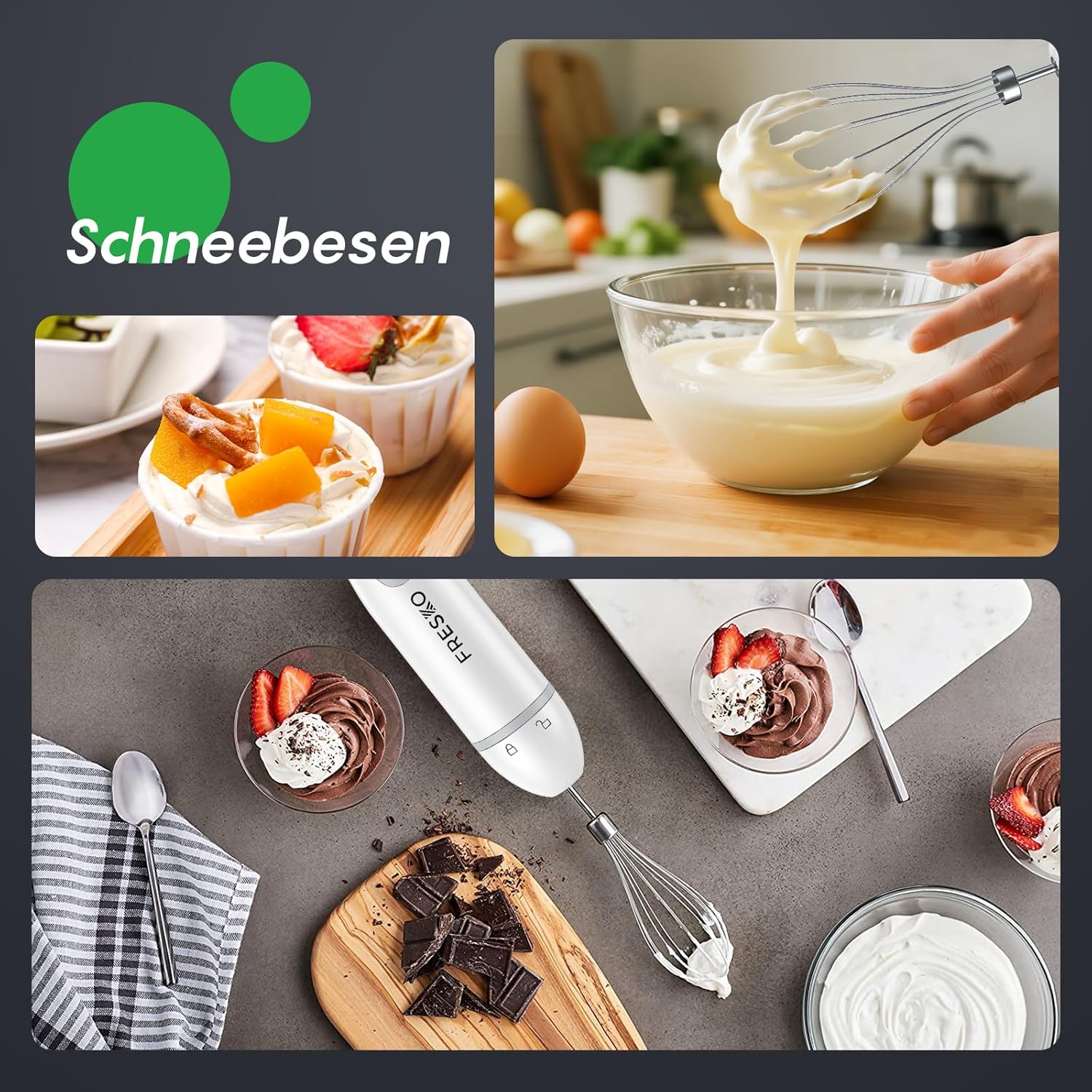 • Комплект миксер 4 в 1: оборудван с миксер, бъркалка, чопър и мерителна чаша. За смутита, пюрирани супи и натрошен сладолед, пригответе сметана и перфектно разбити яйца. Лесно нарязва ядки, месо и зеленчуци.