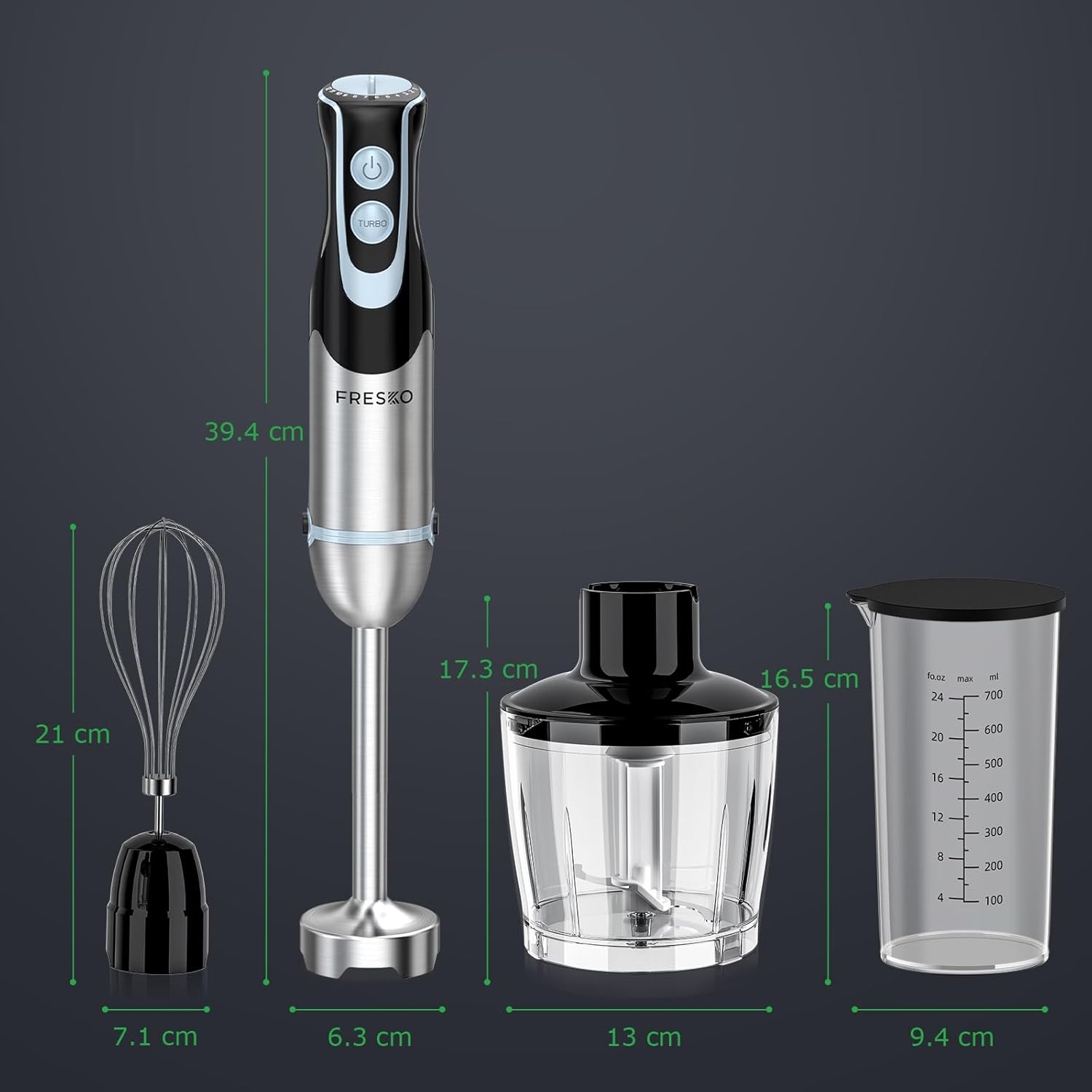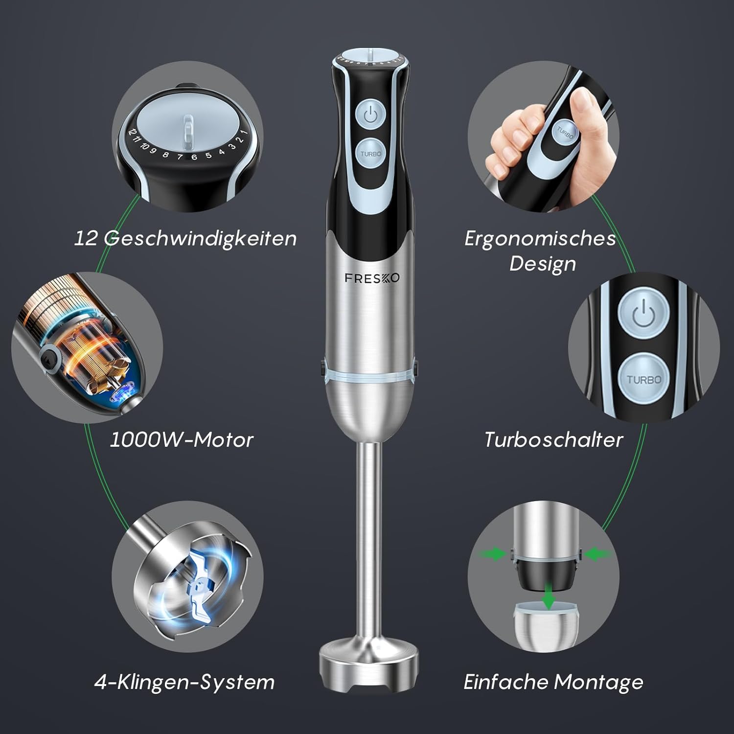 Ръчен блендер FRESKO 4 в 1 от неръждаема стомана, 1000 W пюре с 12 скорости и турбо режими, включва бъркалка, 500 мл рязане на храна и 700 мл мерителна чаша, за бебешка храна, супа, смутита