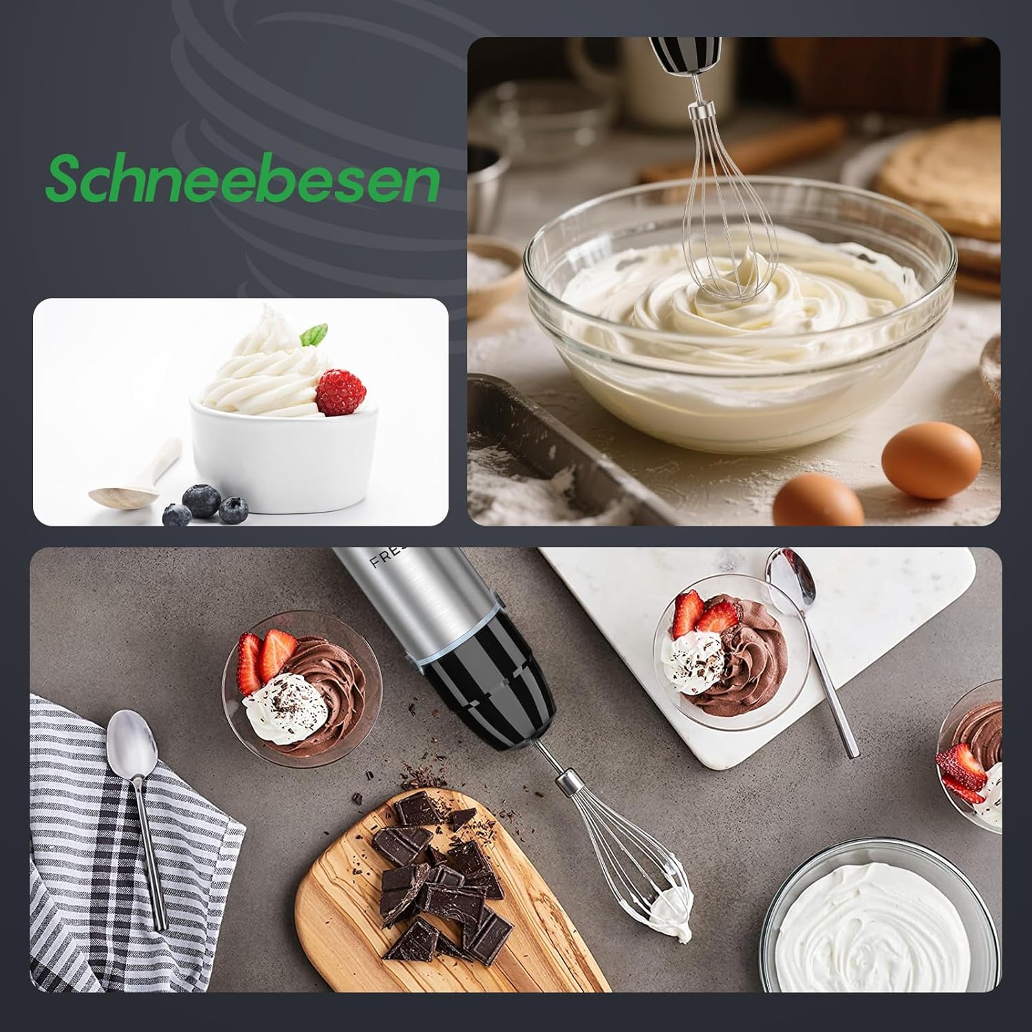• Комплект миксер 4 в 1: оборудван с миксер, бъркалка, чопър и мерителна чаша. За смутита, пюрирани супи и натрошен сладолед, пригответе сметана и перфектно разбити яйца. Лесно нарязва ядки, месо и зеленчуци.
