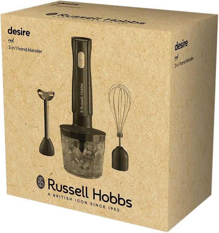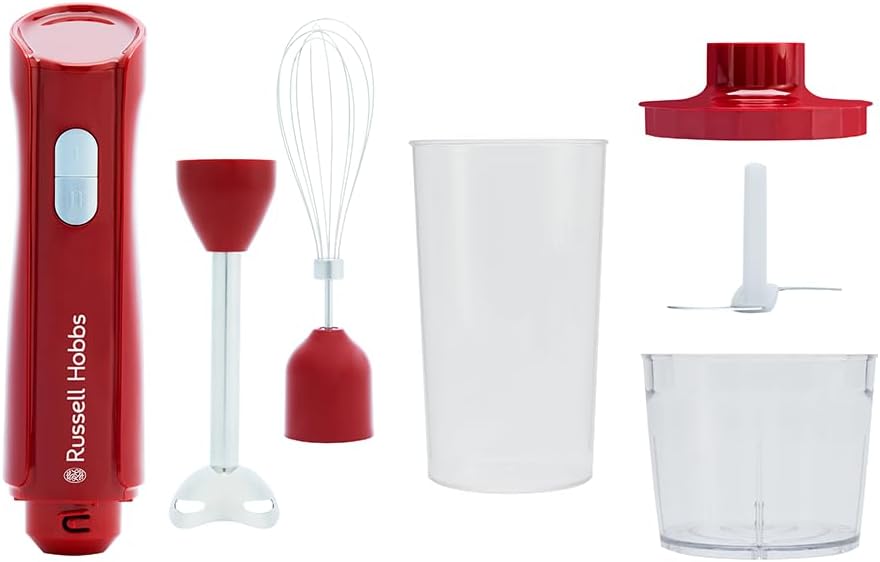 Ръчен блендер Russell Hobbs Desire Red 27142-56 [3 в 1: миксер, бъркалка и чопър/пюре] (чаша за смесване 600 мл, аксесоари, подходящи за съдомиялна машина, нож от неръждаема стомана, за смутита, супи, сосове и дипове)