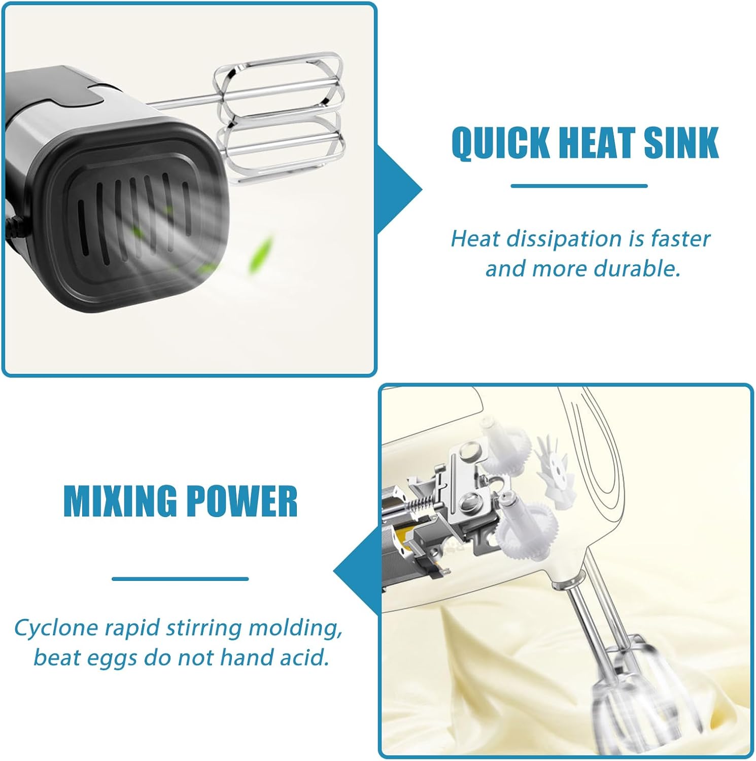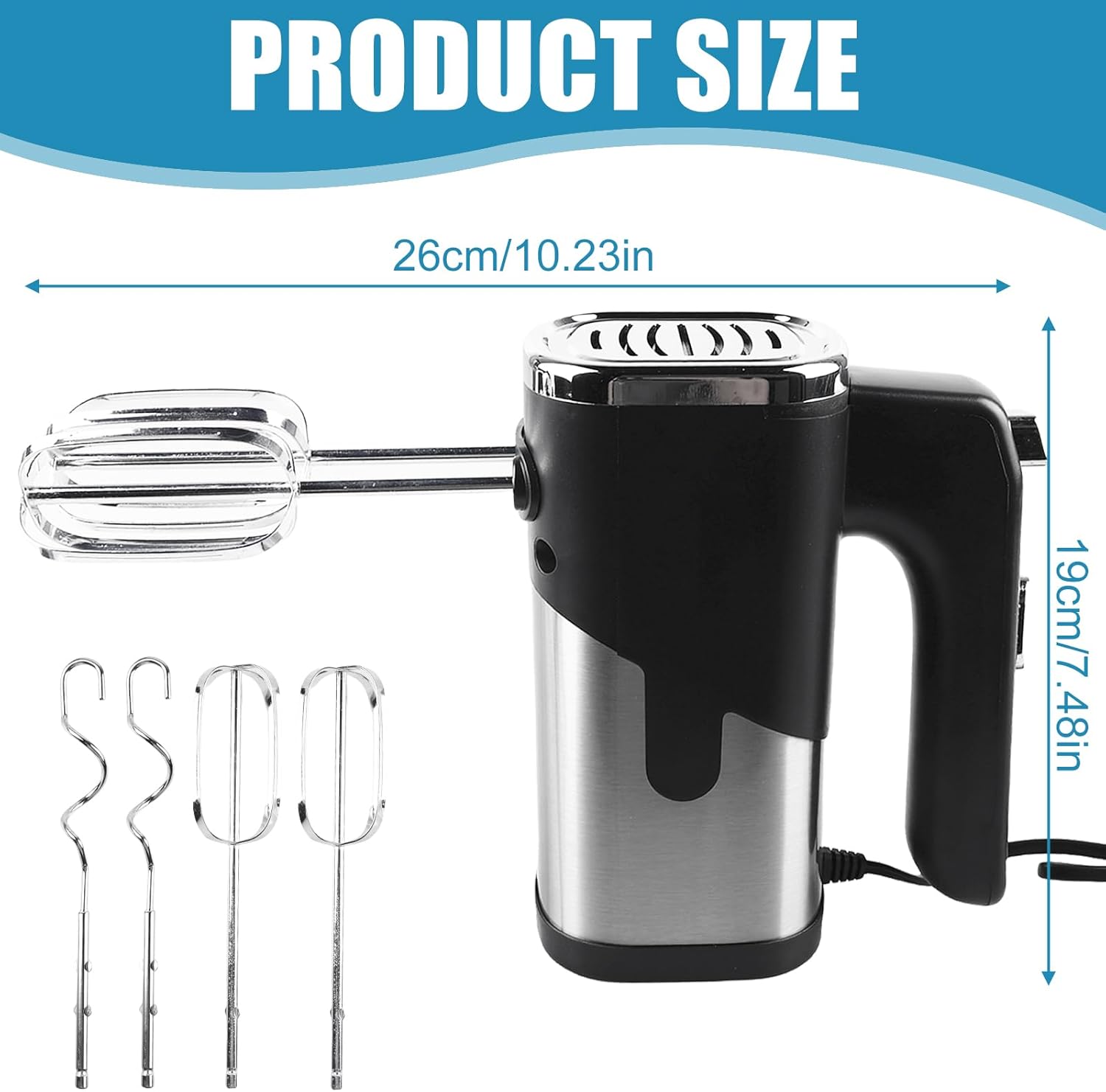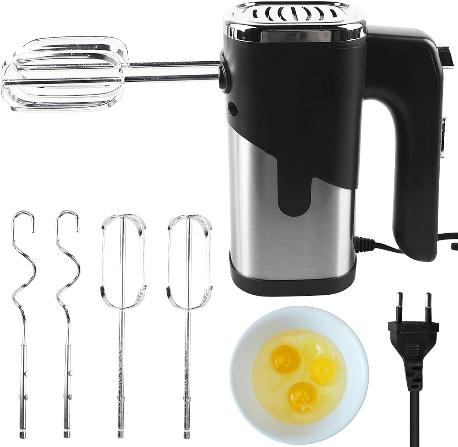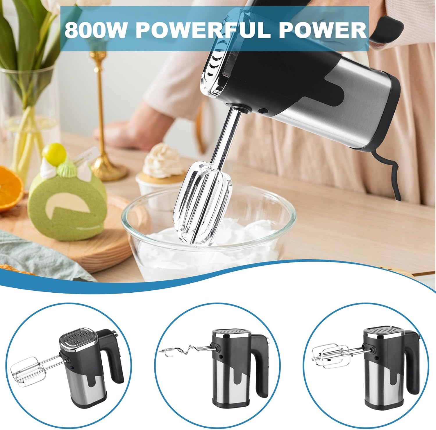 Dieses Produkt verfügt über einen leistungsstarken 800W Motor, ein flexibles Netzkabel für eine einfache Bewegung, 2 Rührbesen für Eier und Sahne und 2 Knethaken zum Mischen von Teig am besten zum Herstellen von Schlagsahne aus Sahne, zum Schlagen von Eiern zu einem Baiser oder zum Mischen von dünnem Kuchenteig.