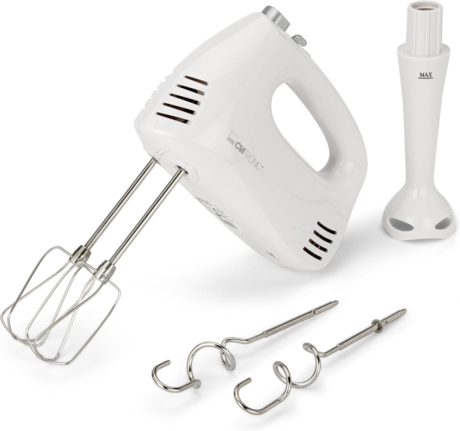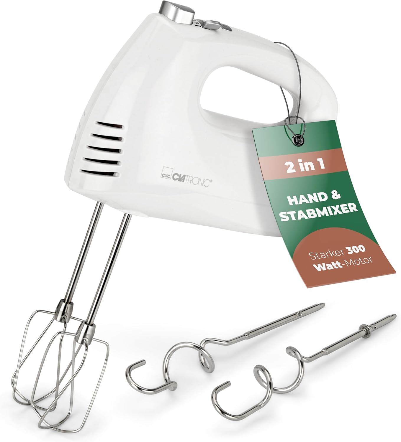 - Ръчен и ръчен пасатор в едно - Мощен 300-ватов мотор - 5 скорости - Турбо ниво - Бутон за изваждане - Аксесоари: 2 бъркалки от неръждаема стомана, 2 месални апарата от неръждаема стомана и бързи пръчки за смесване - Бъркалка и кука за тесто от неръждаема стомана, подходящи за съдомиялна машина - Захранване: 220-240 V, 50/60 Hz - Консумирана мощност: 300 W