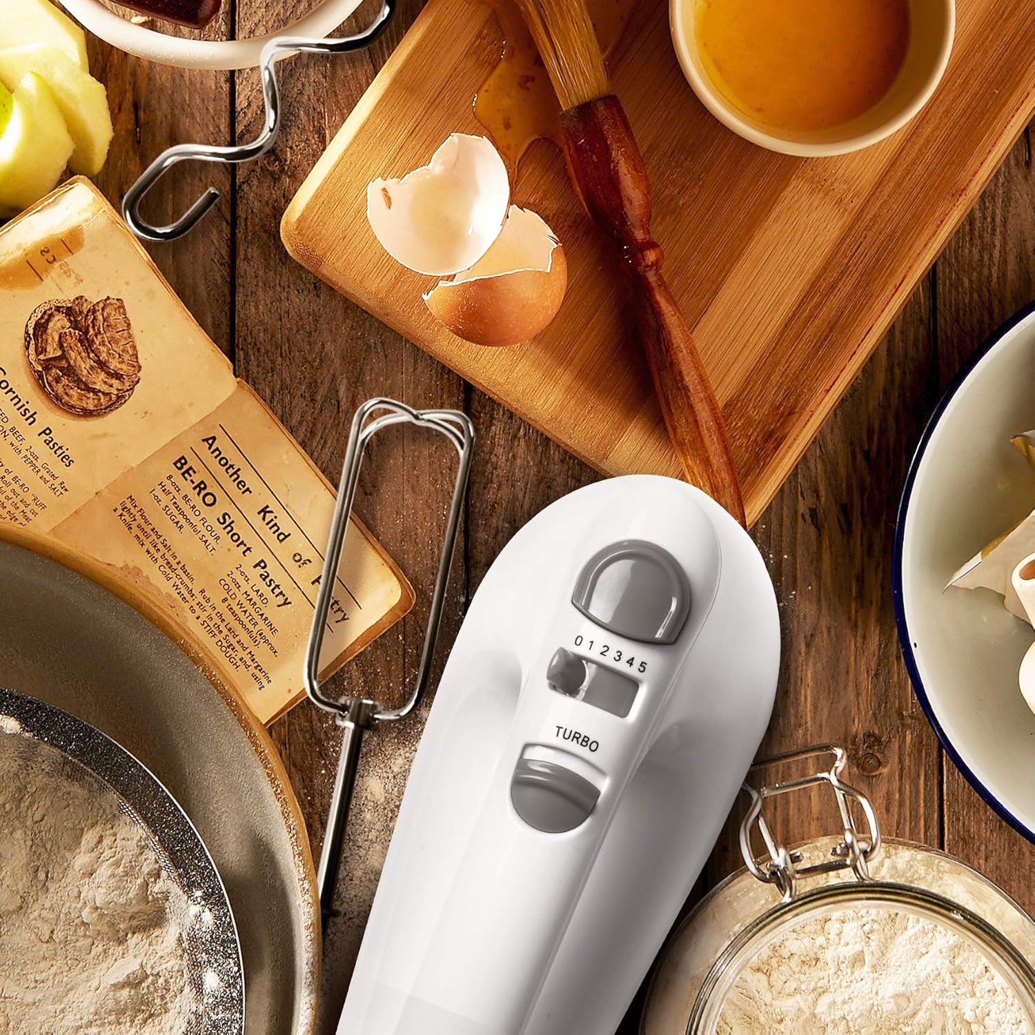 • Уредът се предлага с всички традиционни аксесоари, като две куки за тесто, две бъркалки и тел. Благодарение на специалния бутон, лампата може лесно да се разглоби и да се държи перфектно дори по време на работа. С този аксесоар можете да месите тесто, да разбивате яйца на сняг или да смесвате любимите си рецепти.
