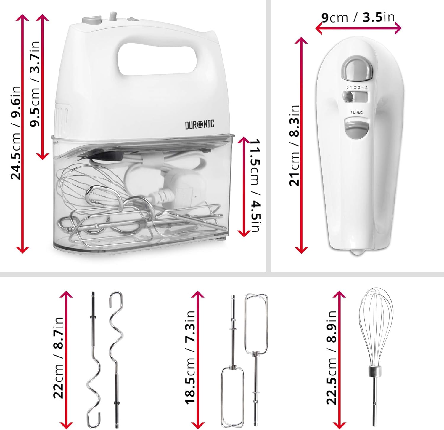 Ръчен миксер Duronic HM4 с турбо функция, бъркалка от неръждаема стомана, кука за тесто и бъркалка и кутия за съхранение, 400 W