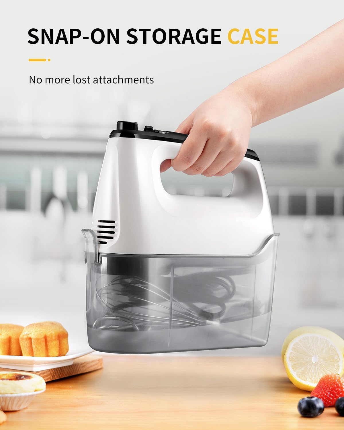• Преносим ръчен миксер: с помощта на практичния калъф за съхранение можете лесно да съхранявате всички аксесоари, без повече притеснения за загуба на аксесоари и същевременно поддържайки кухнята подредена. Освен това, кутията може да се закачи към блендера, така че е достатъчно преносим за дома/пътуването.