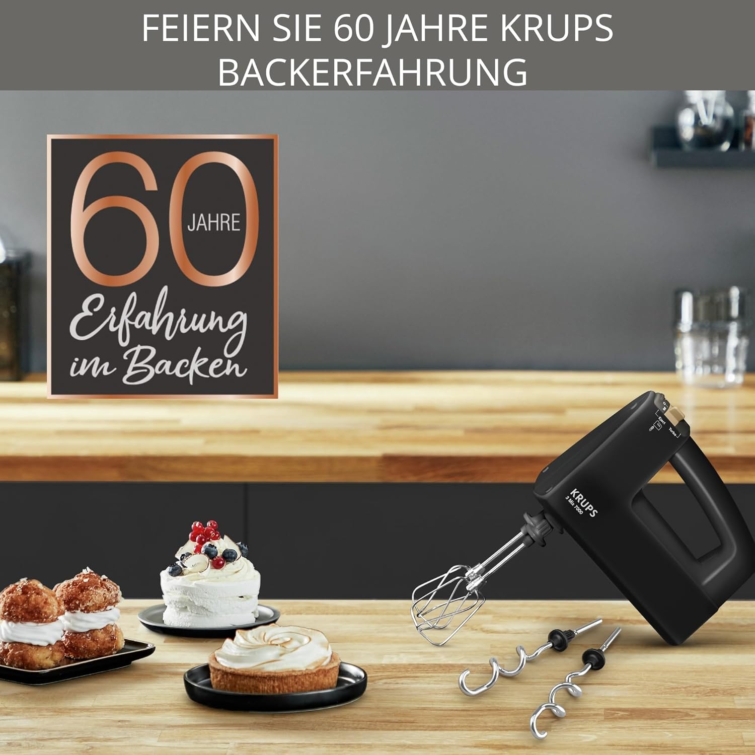 Ръчен миксер Krups 3 MIX 7000, 60-годишно издание, F6085, 500 W, ергономична дръжка, кабел 1,65 м, контрол на скоростта, бъркалка и кука за тесто, неръждаема стомана, до 1 кг тесто за хляб, черен, меден
