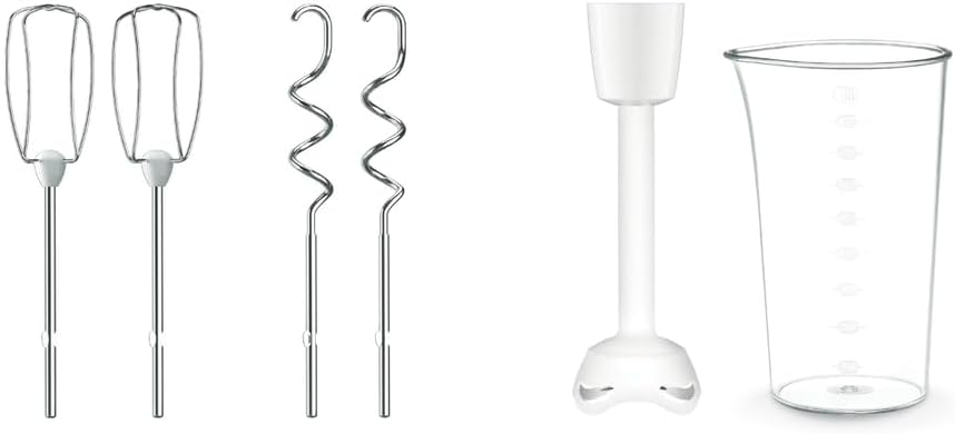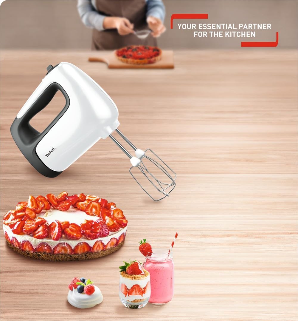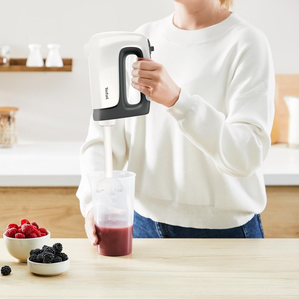 Нищо не може да се сравни с домашно приготвените печени изделия. С този ръчен миксер всички ваши приготовления са успешни - вашето семейство и приятели ще бъдат изумени от вашите прясно изпечени творения. Tefal предлага идеалния спътник за перфектни резултати при печене: ръчния миксер Tefal Prep'Mix+. Универсалният ръчен миксер предлага безкрайни възможности с високопроизводителен мотор от 500 W, който е идеален за леки и твърди приготовления. С двете бъркалки от неръждаема стомана, лесно смесените и разбити приготовления могат да се правят без усилие, а двете куки за тесто са идеални за твърдо тесто. Мощна пръчка за пюре от своя страна осигурява фино пасирана храна. Открийте колко лесно е смесването благодарение на петте скорости и турбо настройката на ръчния миксер Prep'Mix+.