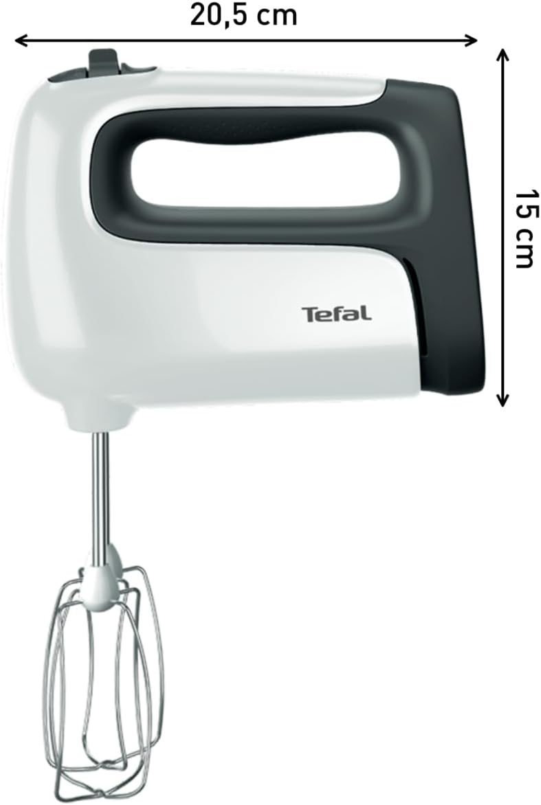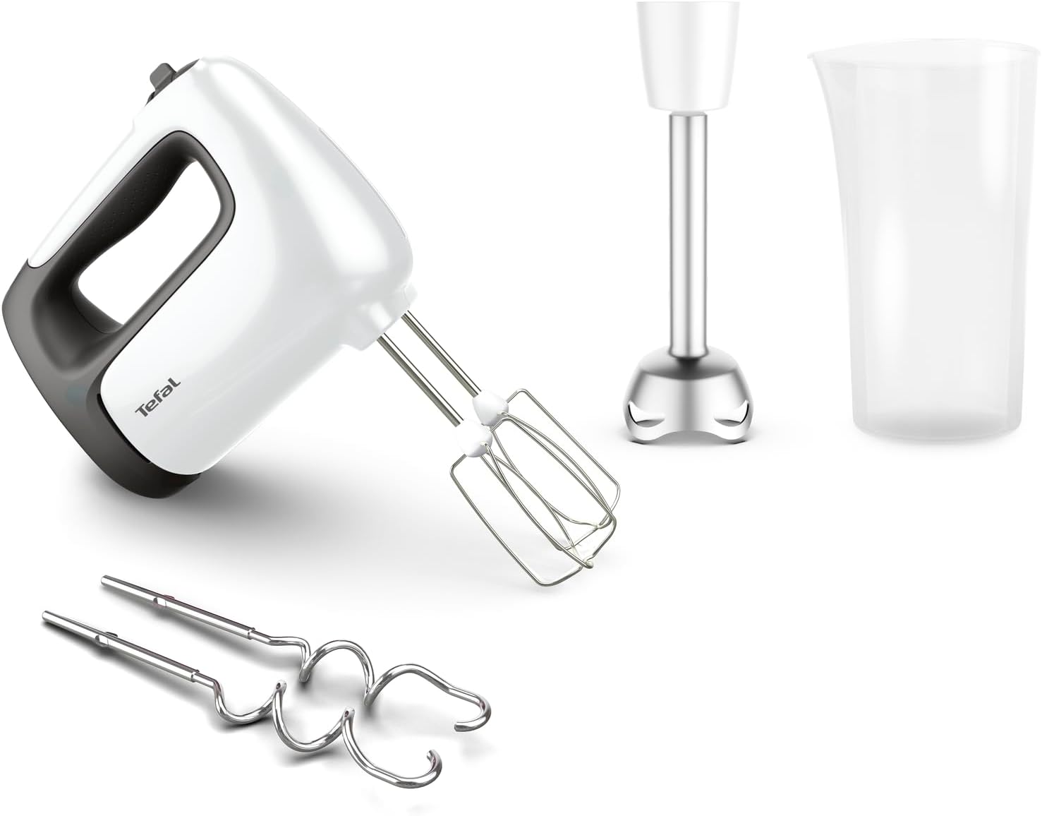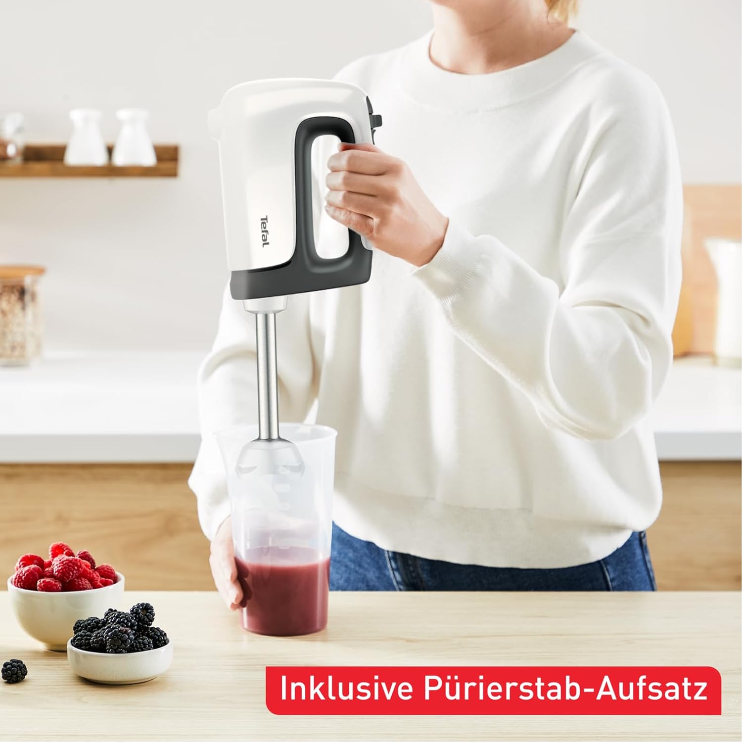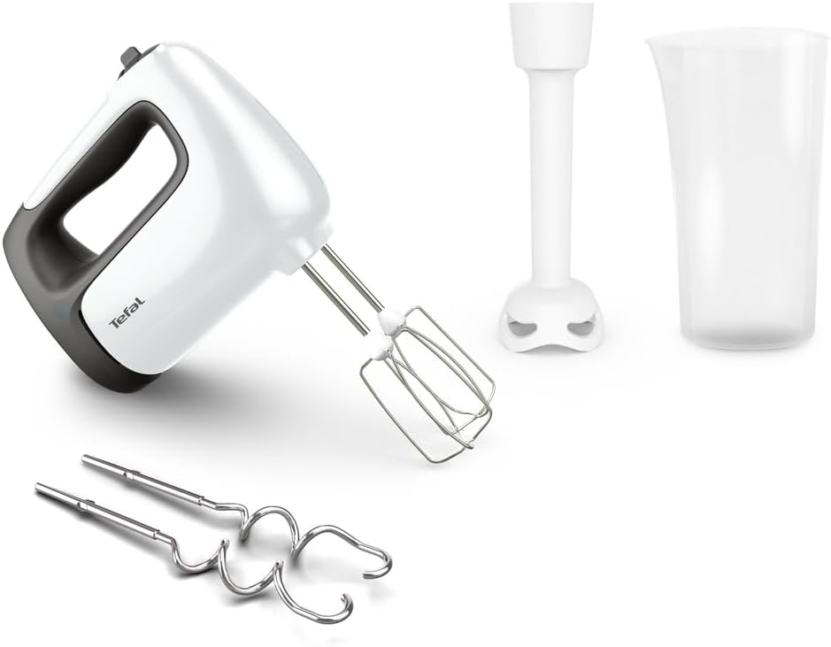 Нищо не може да се сравни с домашно приготвените печени изделия. С този ръчен миксер всички ваши приготовления са успешни - вашето семейство и приятели ще бъдат изумени от вашите прясно изпечени творения. Tefal предлага идеалния спътник за перфектни резултати при печене: ръчния миксер Tefal Prep'Mix+. Универсалният ръчен миксер предлага безкрайни възможности с високопроизводителен мотор от 500 W, който е идеален за леки и твърди приготовления. С двете бъркалки от неръждаема стомана, лесно смесените и разбити приготовления могат да се правят без усилие, а двете куки за тесто са идеални за твърдо тесто. Мощна пръчка за пюре от своя страна осигурява фино пасирана храна. Открийте колко лесно е смесването благодарение на петте скорости и турбо настройката на ръчния миксер Prep'Mix+.