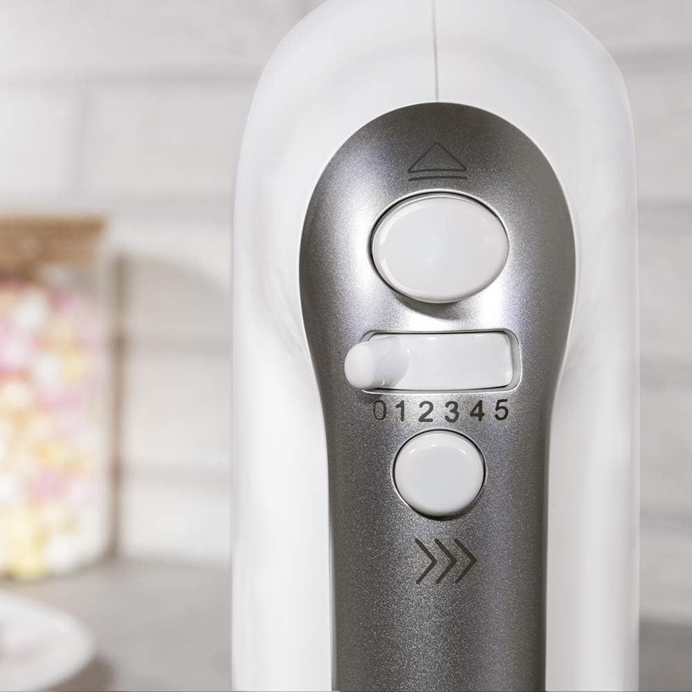 Ръчен блендер за безпроблемно разбиване, смесване, сглобяване, разбъркване и месене за постигане на резултати от висшата кухня. Мощен 500W мотор за отлични резултати само за няколко секунди. В допълнение, удължава максималния живот на миксера. Самовъртяща се купа с максимален капацитет от 3,5 литра, която самоцентрира всички съставки за оптимално смесване. Включва балонна пръчка от неръждаема стомана за перфектно смесване. Има 5 настройки за скорост и турбо функция за лесно адаптиране към всички приготвяния. Разполага с две иновативни бъркалки от неръждаема стомана, които постигат пухкави бисквитки. Разполага с две издръжливи куки за тесто от неръждаема стомана за получаване на хомогенни маси с по-голям обем. Бутон QuickOut за лесно отстраняване на аксесоари и избягване на петна по ръцете. Система за закрепване с вендуза, която позволява лесно повдигане и спускане на рамото с една ръка, за да се вмъкне повече храна по време на процеса, без да се мести основата. Шпатула за тесто, която помага при приготвянето, както за събиране на съдържанието на купата, така и за изглаждане на сместа в контейнера ѝ. Ергономичният му дизайн позволява много по-удобно и сигурно захващане на блендера. Материалите на блендера са без BPA.