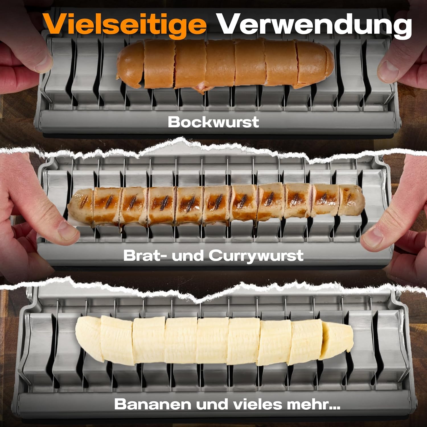 • Перфектни резени наденица с къри за секунди: насладете се без усилие дори на парчета наденица с дебелина 20 мм. Нашият ръчен нож за наденица с къри от неръждаема стомана с 12 ултра остри остриета от неръждаема стомана е вашият специалист за бързото и прецизно приготвяне на наденица с къри и братвурст - идеален за взискателния ценител у дома, който цени професионалното качество.