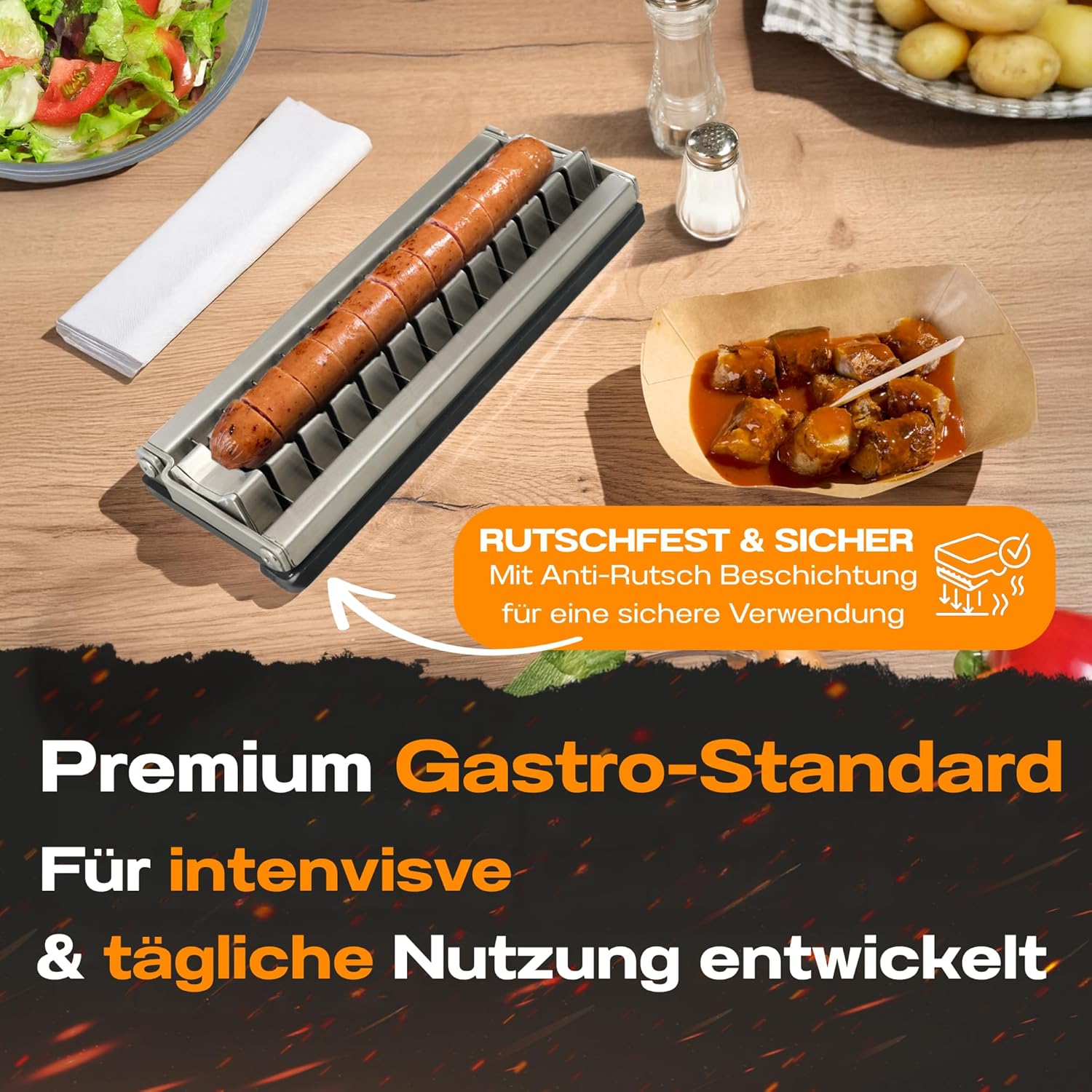 • Максимална безопасност благодарение на противоплъзгащото покритие: без подхлъзване, без клатушкане! Специалното противоплъзгащо покритие от долната страна на този професионален кухненски инструмент, истински професионален аксесоар за готвене, осигурява стабилна стойка на всяка работна повърхност. Той е незаменим аксесоар за барбекю и висококачествени аксесоари за всяко домакинство. Съсредоточете се изцяло върху перфектното рязане на вашата наденица, докато този кухненски помощник остава безопасен като грилован аксесоар за готвене и кухненски аксесоари - за чиста и безопасна работа.