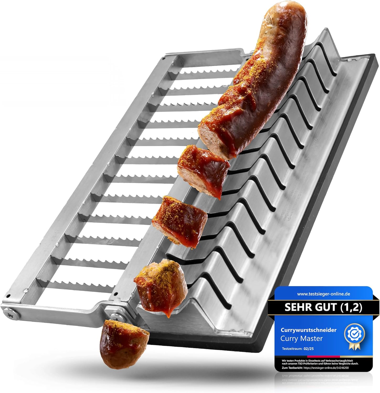 • Лесно и хигиенично почистване – благодаря на неръждаемата стомана: без досадно търкане! Нашата резачка за къри наденица от неръждаема стомана е напълно подходяща за съдомиялна машина. Гладките повърхности на неръждаемата стомана и дизайнът предотвратяват залепването на остатъци. Това я прави лесен за поддръжка кухненски аксесоар, а също и практичен подарък за мъже или жени, които ценят ефективността и хигиената. Готварски уред, който спестява време.