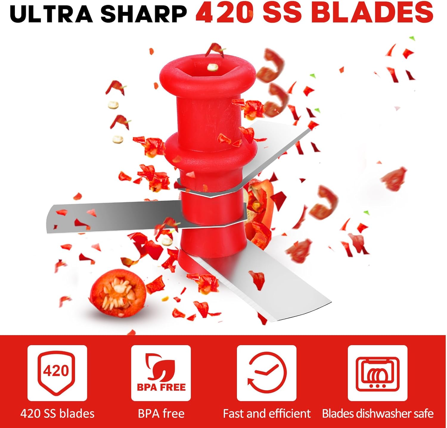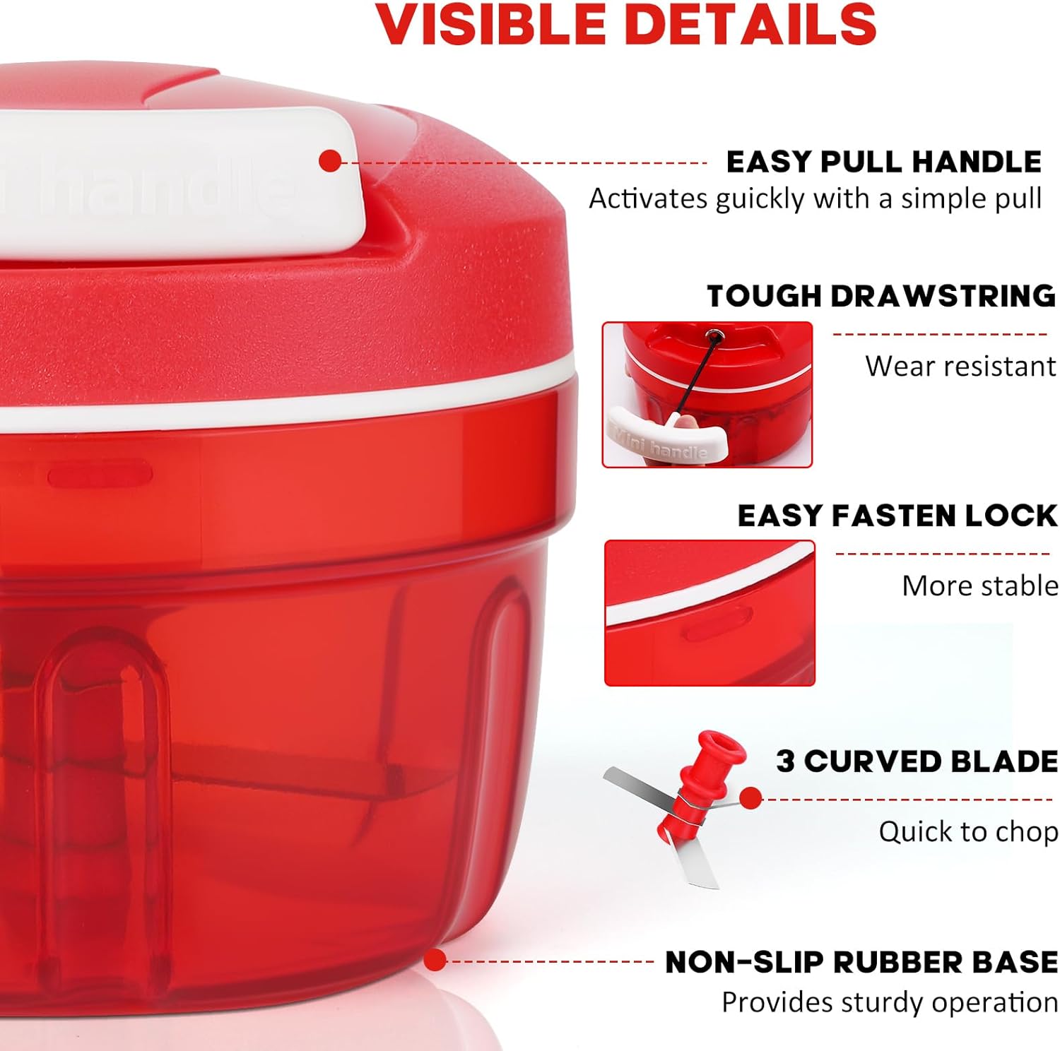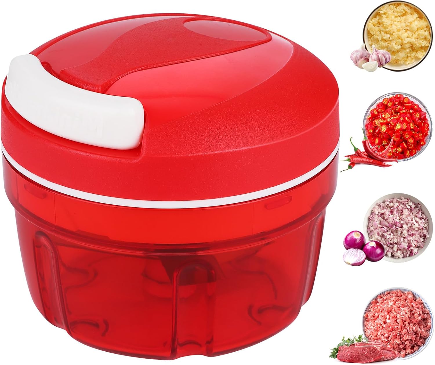 Ръчна резачка за лук, 300 мл резачка за лук с остриета от неръждаема стомана, резачка за чесън, кухненски робот за чили/лук/зеленчуци/ядки/плодове/чушки/месо/чесън/пюрета (червен)