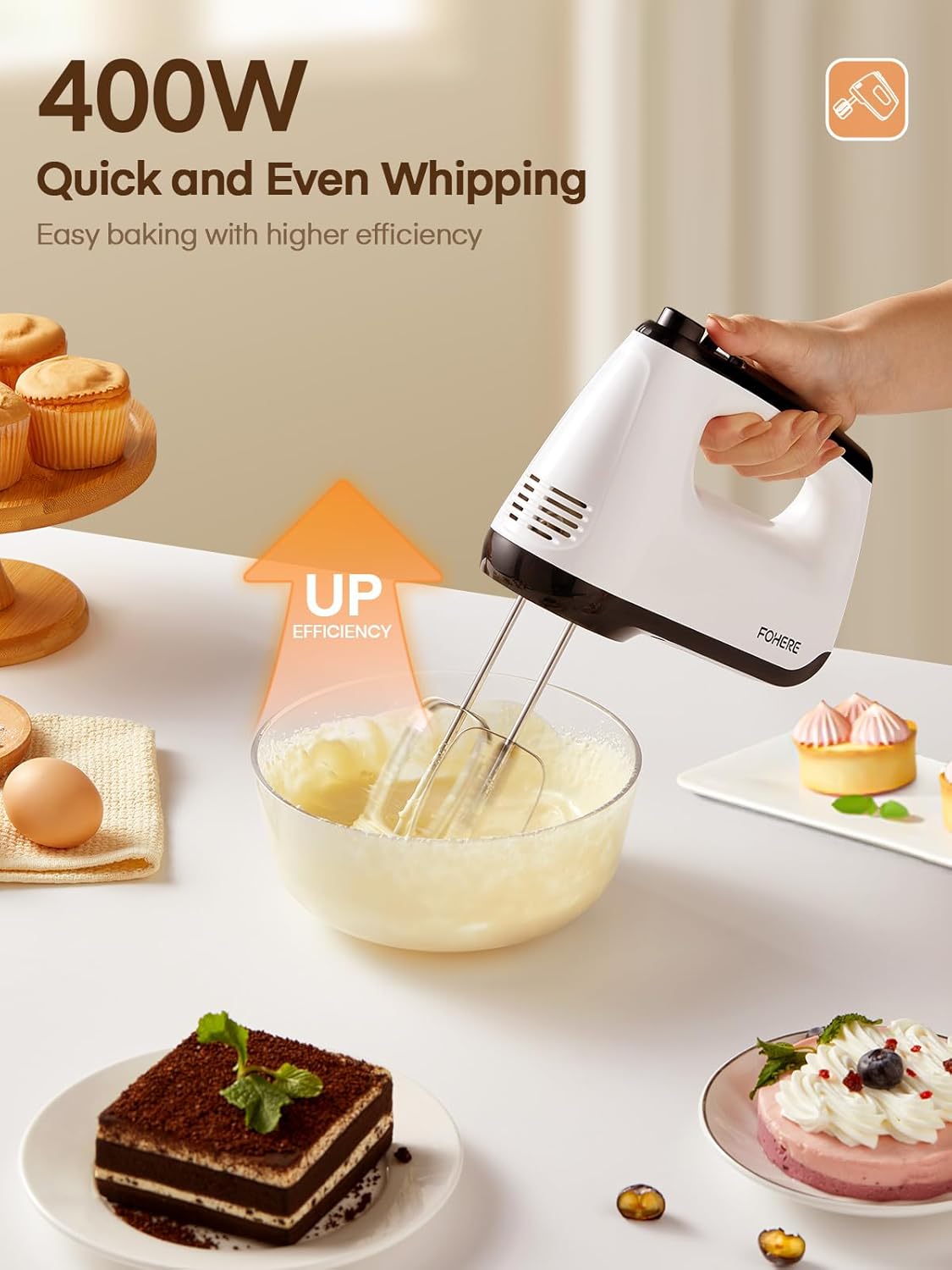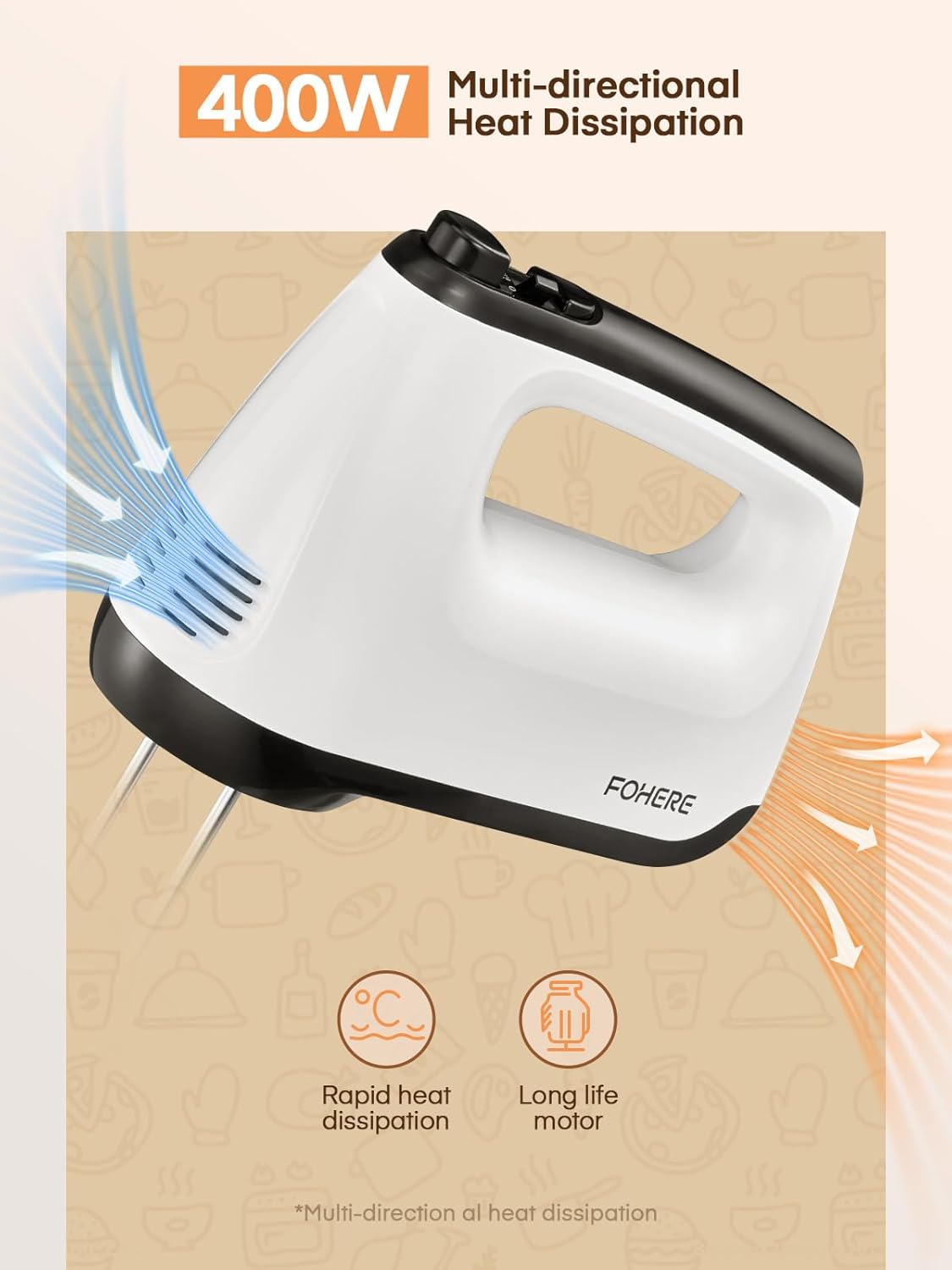 • 400 W по-тих мотор: Мощен електрически ръчен миксер с мощност 400 W, ниско ниво на шум и множество вентилационни отвори за бързо разсейване на топлината.