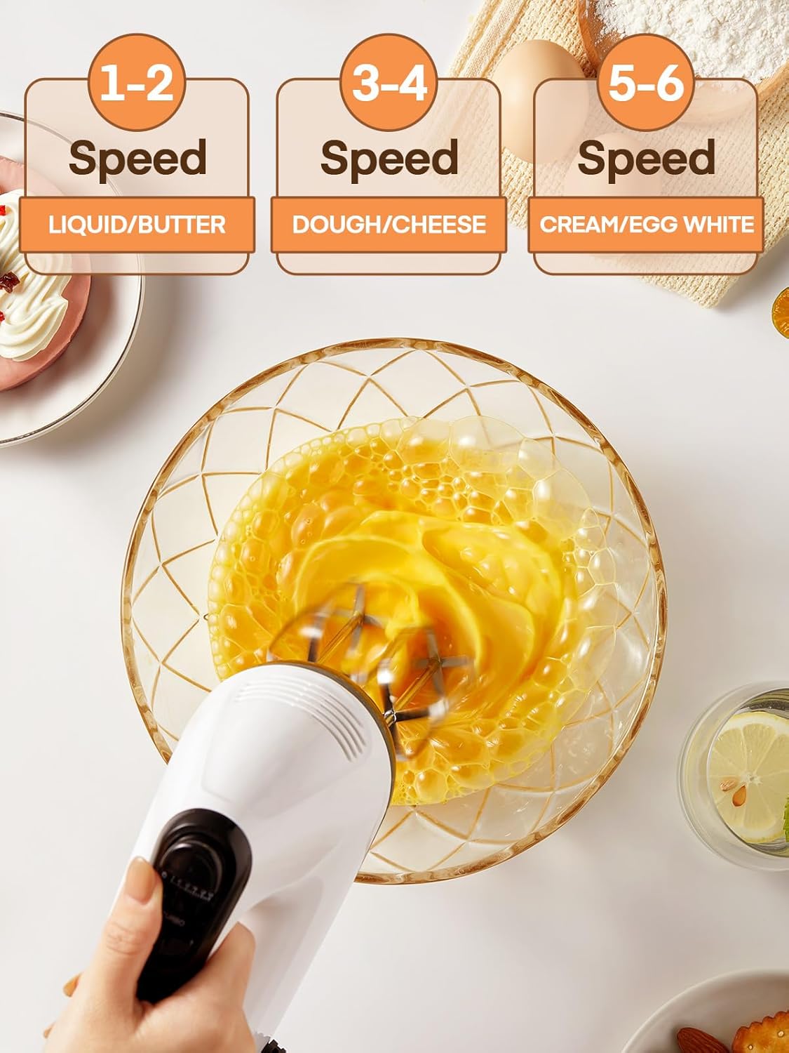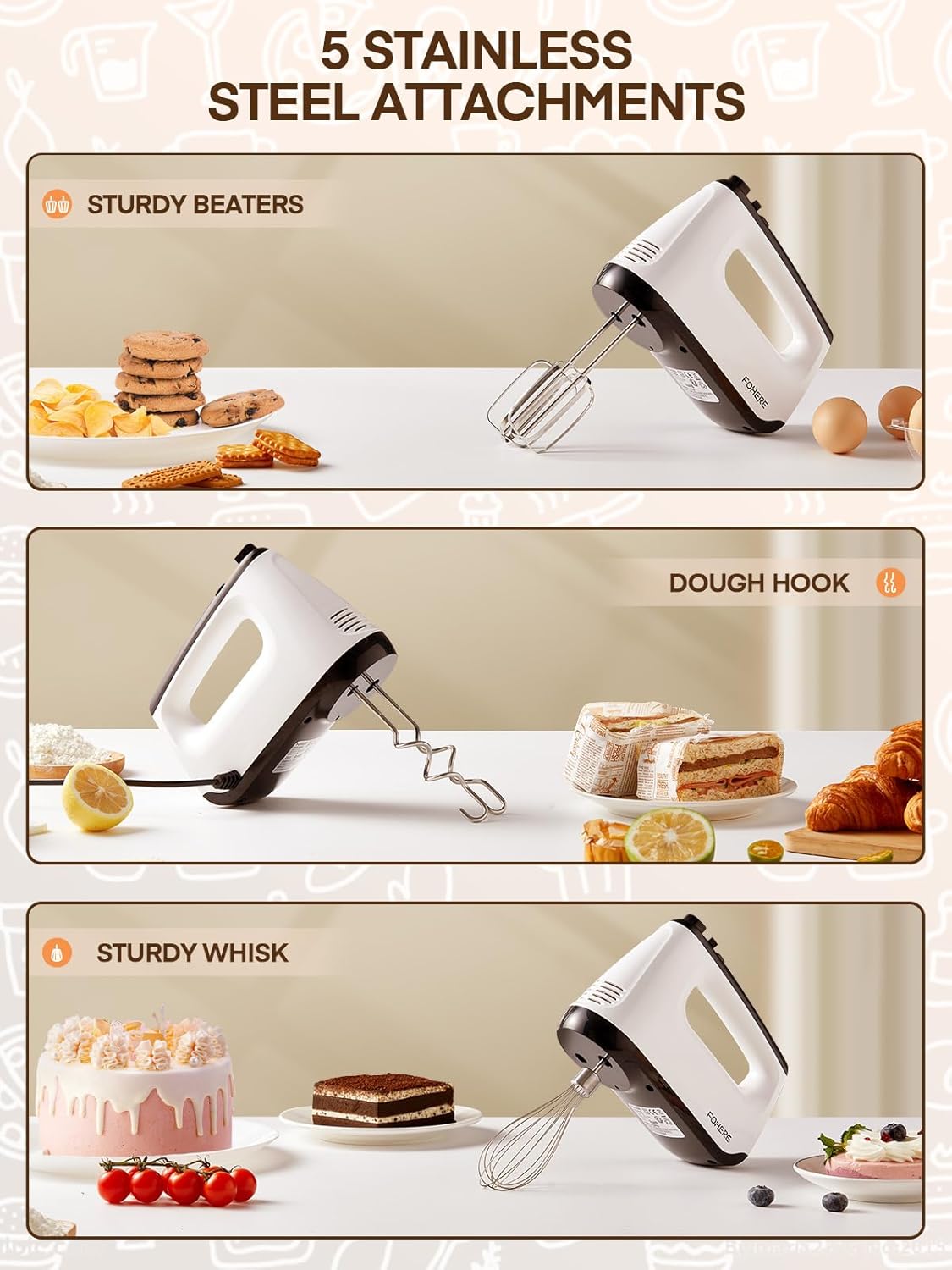 • Многофункционални аксесоари: този комплект ръчни миксери включва 2 x куки за тесто/2 x бъркалка/1 x пръчка за разбиване, всички изработени от неръждаема стомана, и 1 x сепаратор за протеини. С миксер можете да разбиете равномерно всичко - от сметана до тесто за бисквитки. Идеален е и за домашно приготвени рецепти: хляб, торти, пица и др.