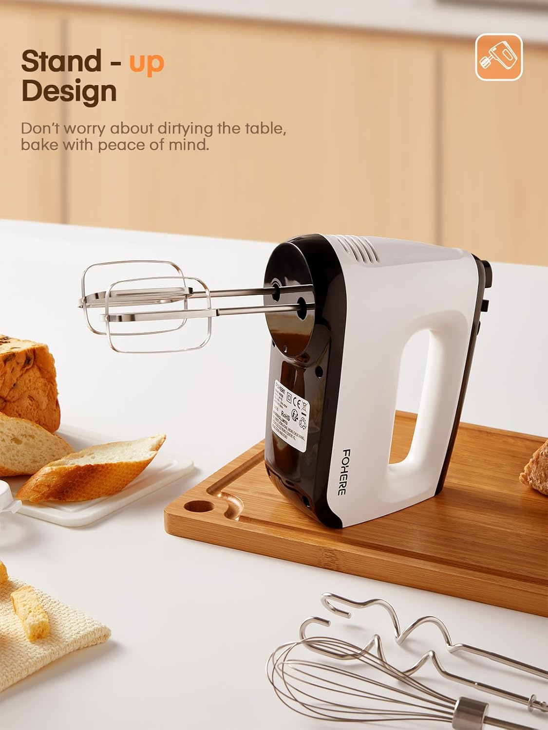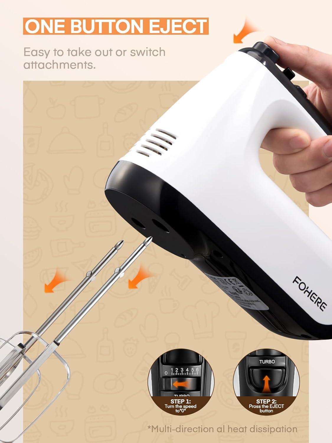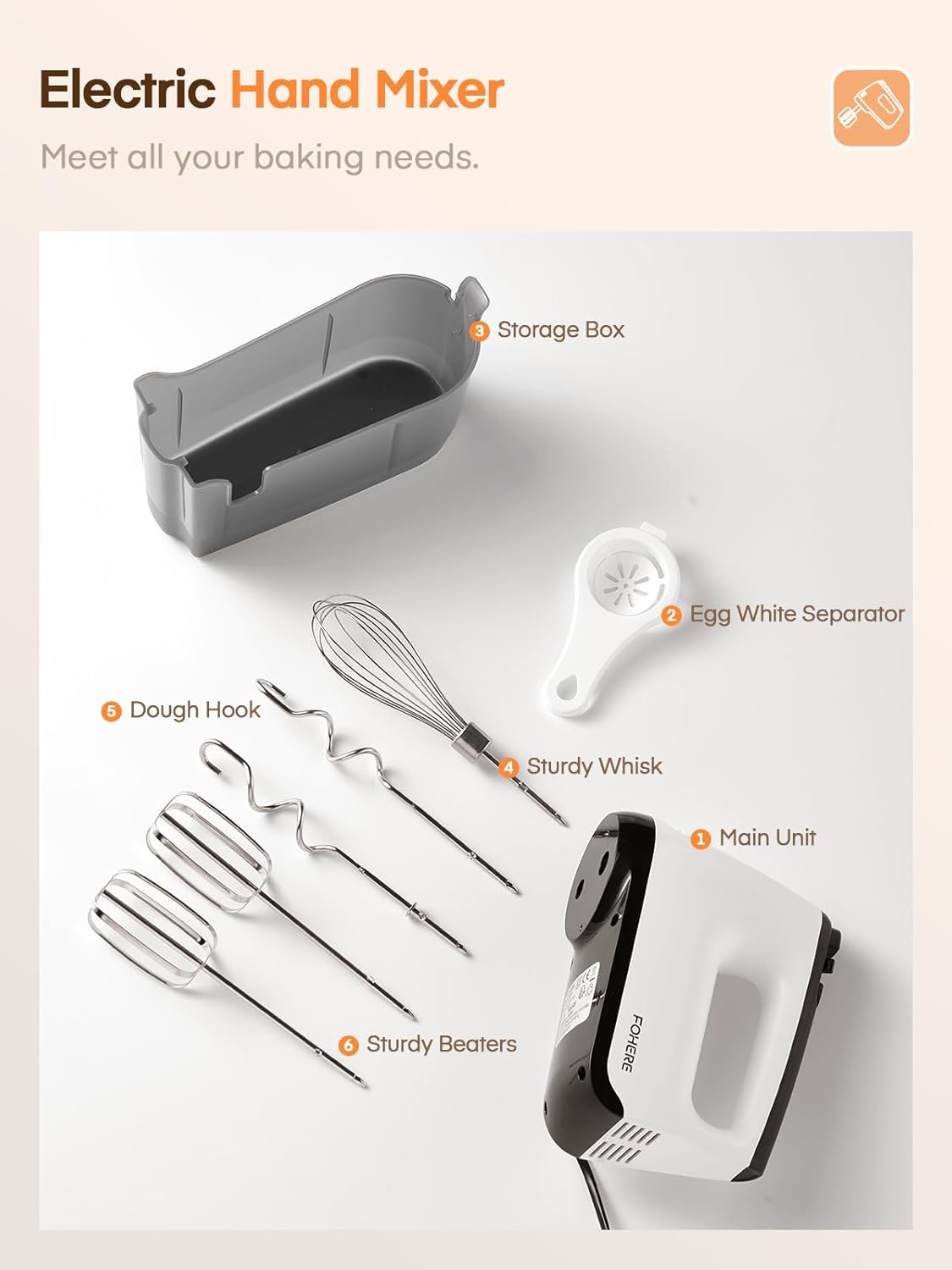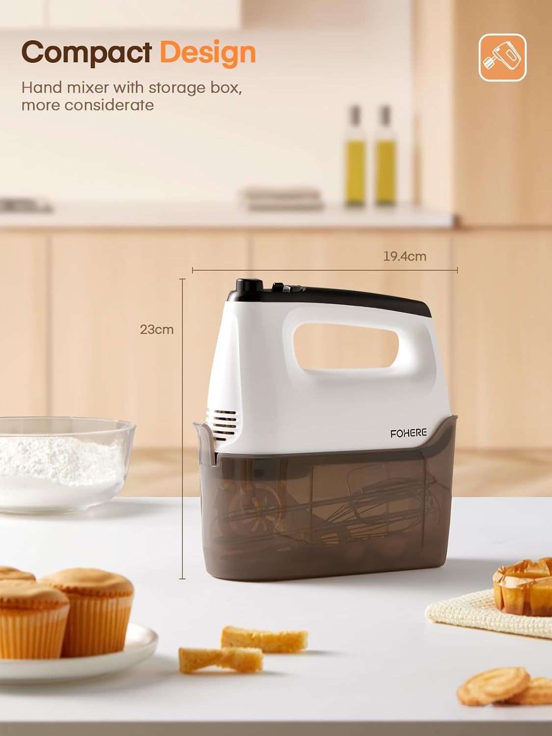 • Ръчен миксер с кутия за съхранение: Нашият ръчен миксер FOHERE се предлага с кутия за съхранение. Можете лесно да съхранявате всички аксесоари, вече не е нужно да се притеснявате, че ще ги загубите, като същевременно поддържате кухнята подредена.