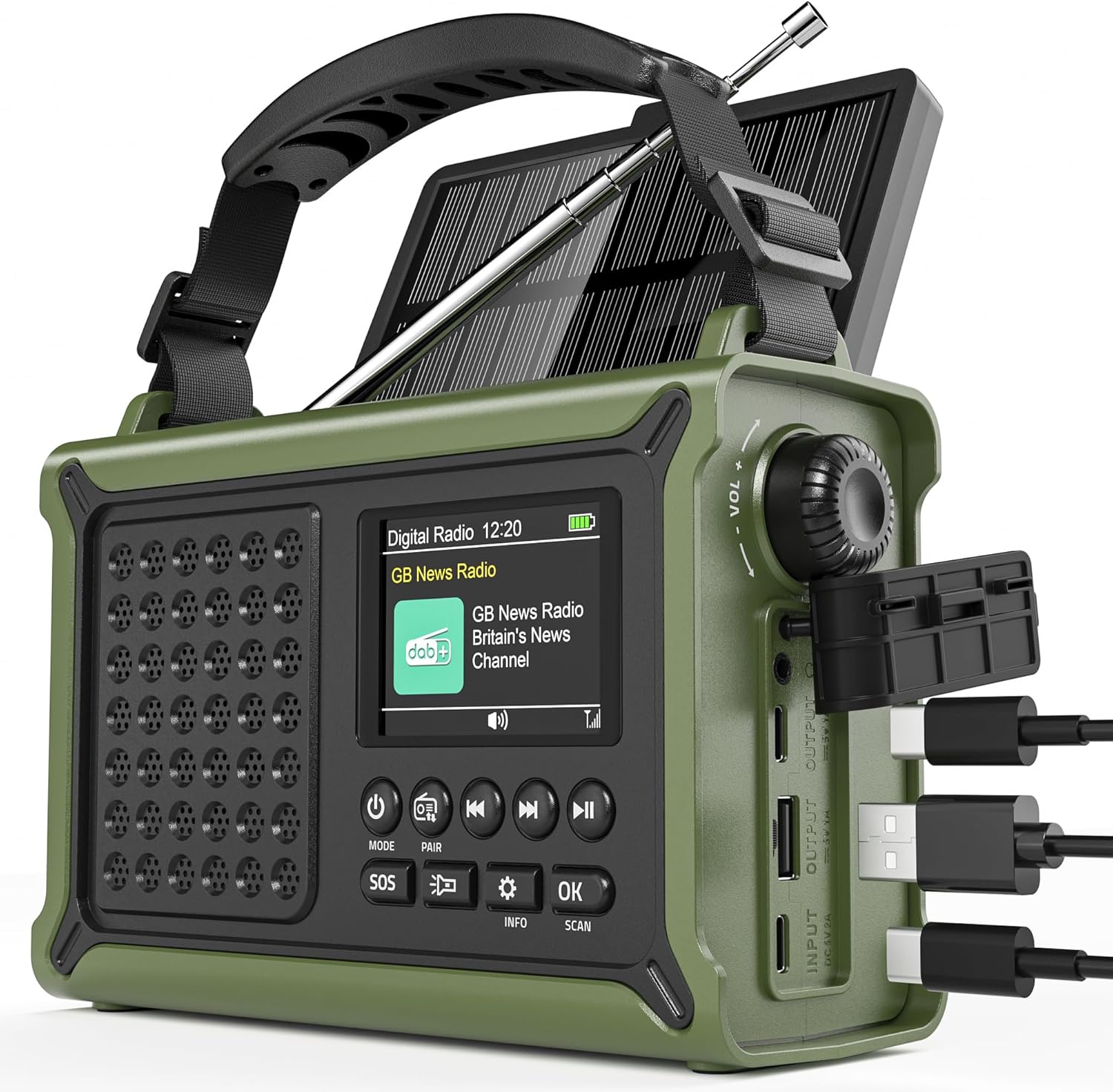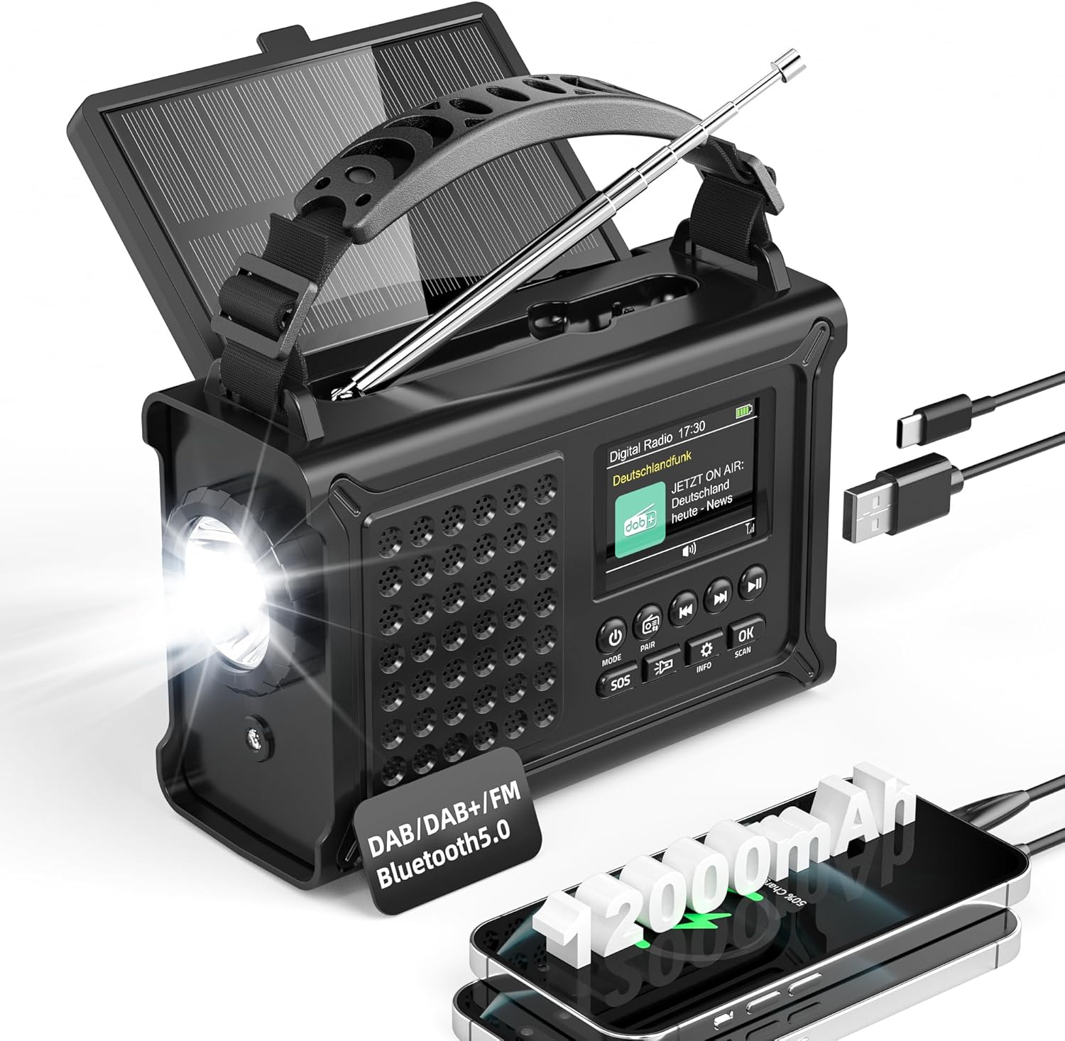 Ръчно радио, DAB/DAB+/FM аварийно радио, с батерия 12000 mAh и соларен панел 8500 mm² и ръчна манивела 650 mA, слънчево радио с динамо и Bluetooth 5.0, като фенерче и зарядно, USB, за къмпинг, аварийни ситуации