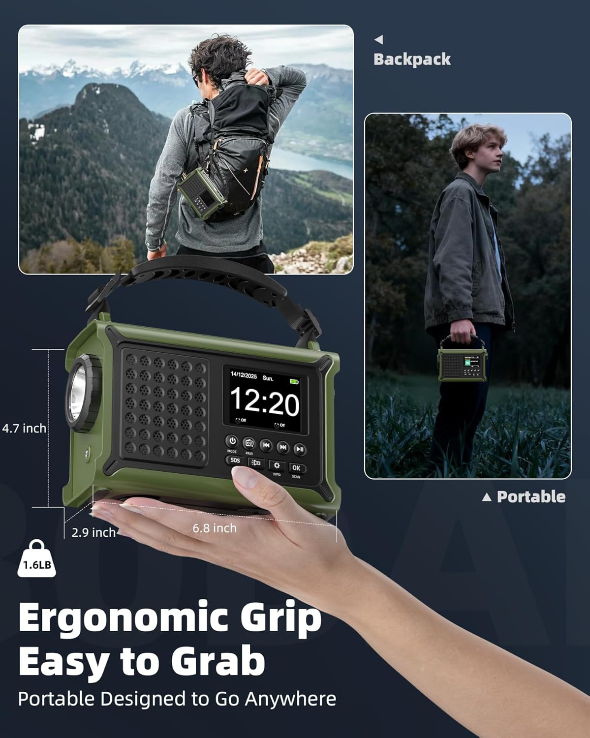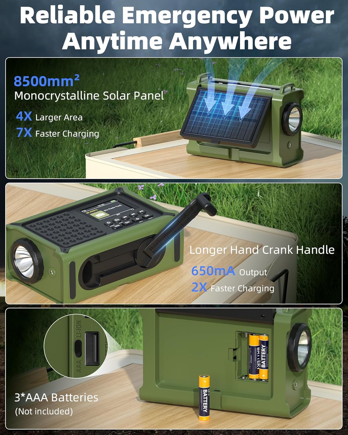 • Ръчна манивела с висок въртящ момент за лесно завъртане и бързо генериране на енергия: интегрираният генератор с подсилени медни намотки и мощни магнити позволява два пъти по-ефективно генериране на енергия от конвенционалното радио с манивела и функция за зареждане на мобилен телефон. Удължената ръчна манивела с висок въртящ момент осигурява минимални усилия и максимална скорост на зареждане. Заредете радиото или телефона си само за 3 минути - идеалното решение за аварийно захранване в движение.