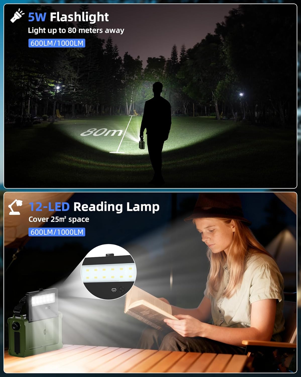 • С LED фенерче и лампа за четене: Това DAB Plus радио/FM радио има два регулируеми източника на светлина. Отляво има мощно 5W LED фенерче, което може да освети зони на разстояние до 70 метра - подходящо за нощно движение, осветление на палатка или аварийно търсене и спасяване. 2,5 W нежна лампа за четене с щадяща очите светлина може да освети стая до 20 м² и е идеалният избор за осветление на къмпинг зоната.