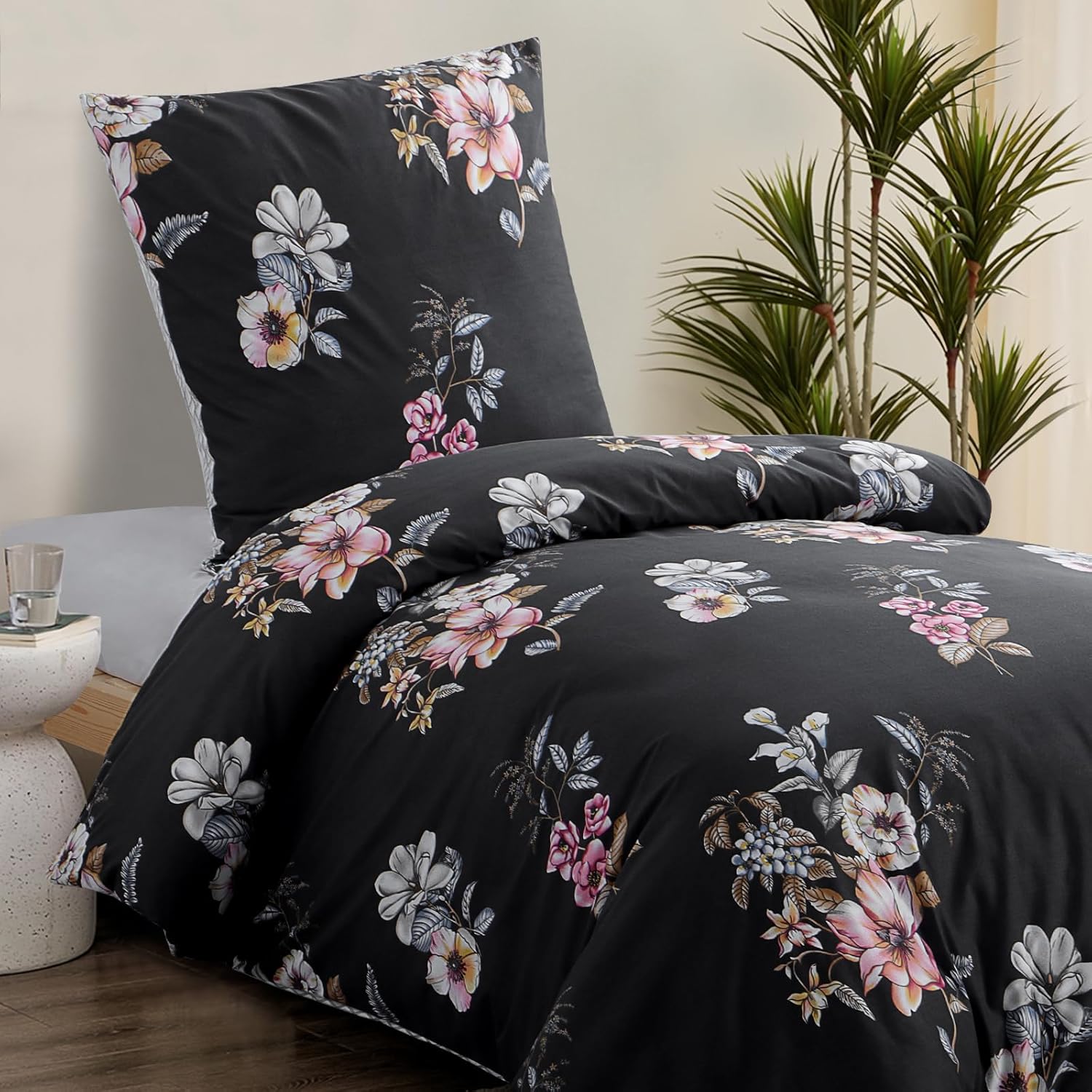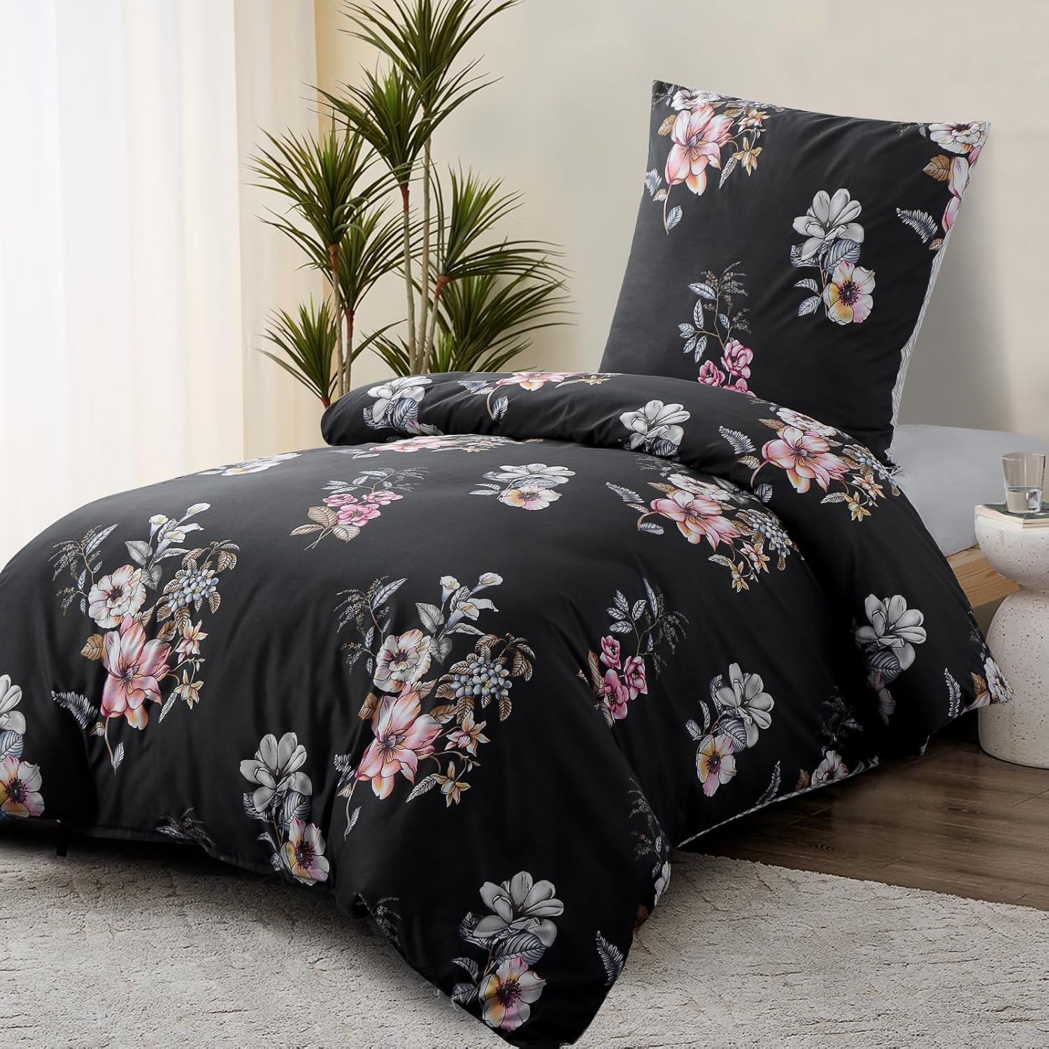 RUIKASI Спално бельо от 2 части, 155 x 220 см, Черно, Плик за завивка 155 x 220 см, Комплект с флорален мотив, Комплекти спално бельо 155 x 220 см, Изработено от микрофибър с цип, Меко и нежелаещо гладене