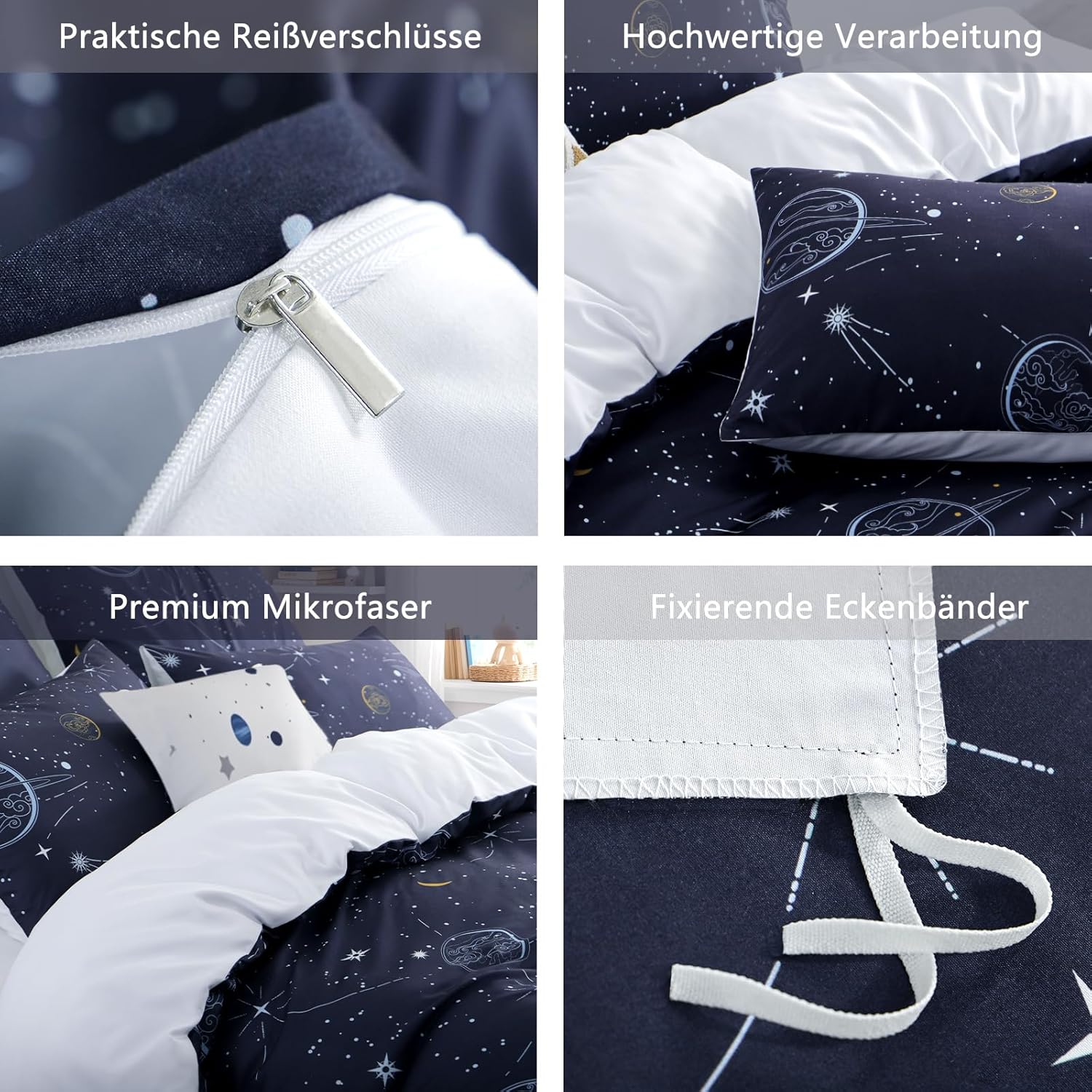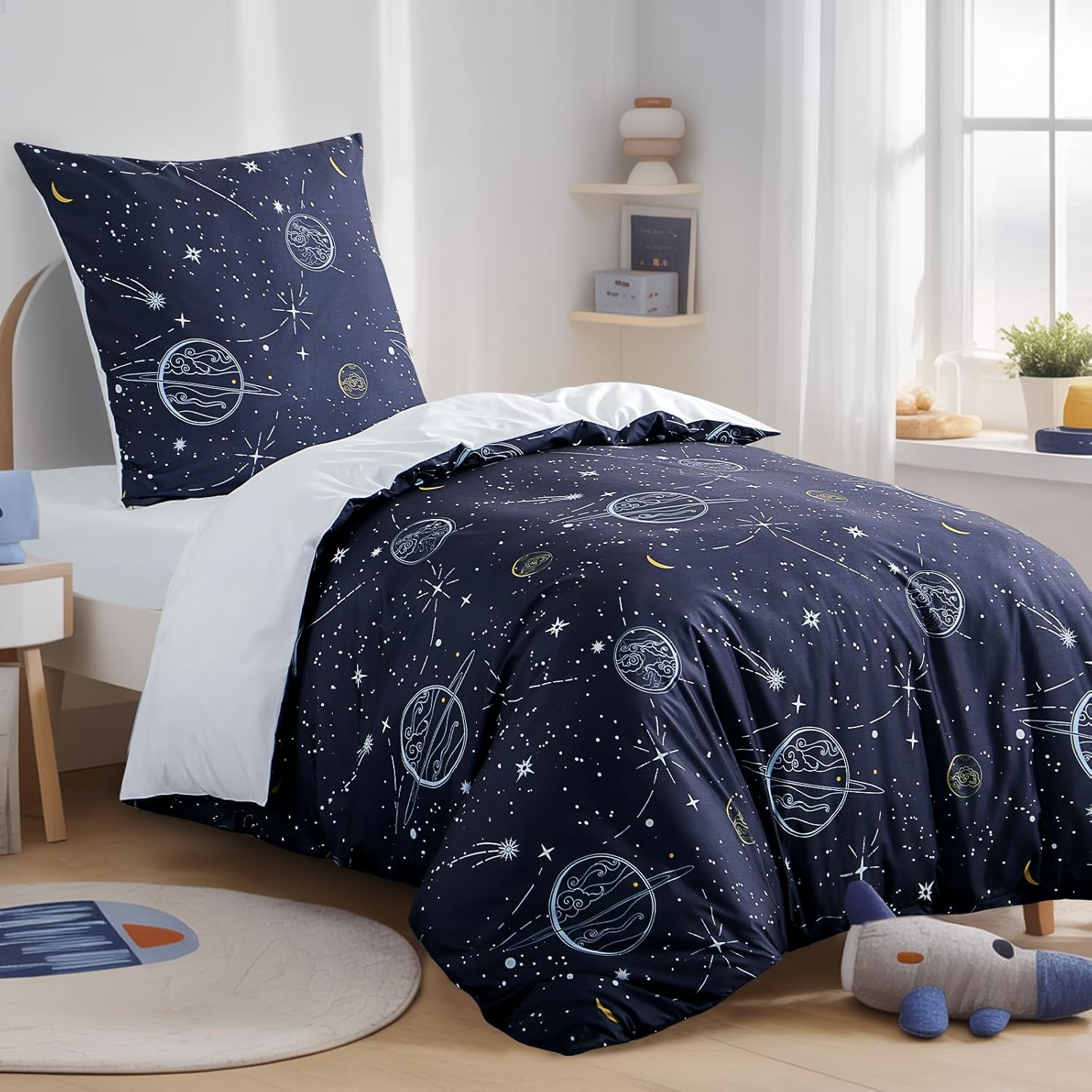 RUIKASI Спално бельо Space 155 x 220 см, 2 части - Комплект калъфи за завивки 155 x 220 см с 1 калъфка за възглавница 80 x 80 см, двустранно спално бельо с шарка на планета за единично легло с цип