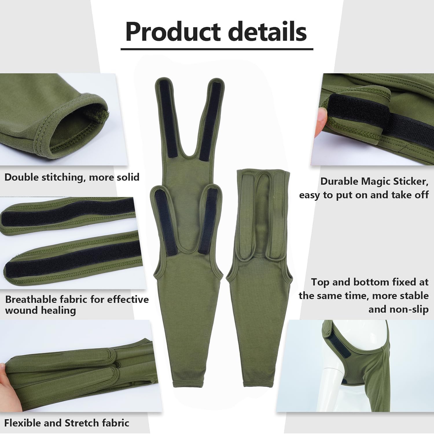 • Висококачествен, силно дишащ материал: Този протектор за предни крака за кучета е изработен от 98% памук и 5% еластан, което прави материята мека и дишаща. Може да се използва и от външната страна на превръзка, за да се предотврати замърсяването ѝ, подпомага заздравяването на рани и има успокояващ ефект върху повечето кучета, намалявайки чувството на тревожност или стрес. Може да се пере и да се използва многократно.