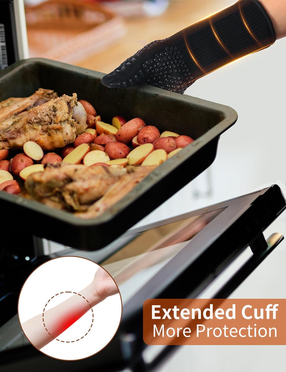 • ПРЕМИУМ МАТЕРИАЛ С ТРИ СЛОЯ Нашите термоустойчиви ръкавици имат интелигентен трислоен дизайн. Външният слой има силиконови ленти за сигурно захващане, предотвратявайки подхлъзване на предмети. Средният слой е изработен от ултраздрави арамидни влакна, които са идеални за високи температури и пожарозащита. Вътрешният слой е смес от полиестер и памук, която предотвратява алергии и осигурява допълнителен комфорт, за да се осигури удобно усещане.