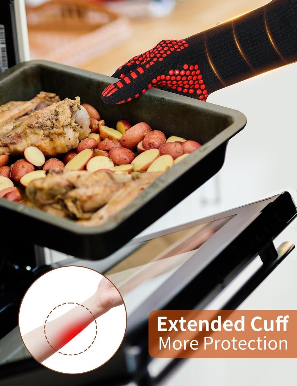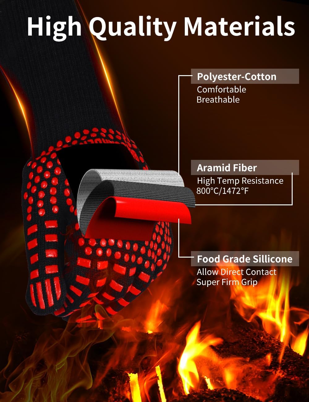 • ПРЕМИУМ МАТЕРИАЛ С ТРИ СЛОЯ Нашите термоустойчиви ръкавици имат интелигентен трислоен дизайн. Външният слой има силиконови ленти за сигурно захващане, предотвратявайки подхлъзване на предмети. Средният слой е изработен от ултраздрави арамидни влакна, които са идеални за високи температури и пожарозащита. Вътрешният слой е смес от полиестер и памук, която предотвратява алергии и осигурява допълнителен комфорт, за да се осигури удобно усещане.
