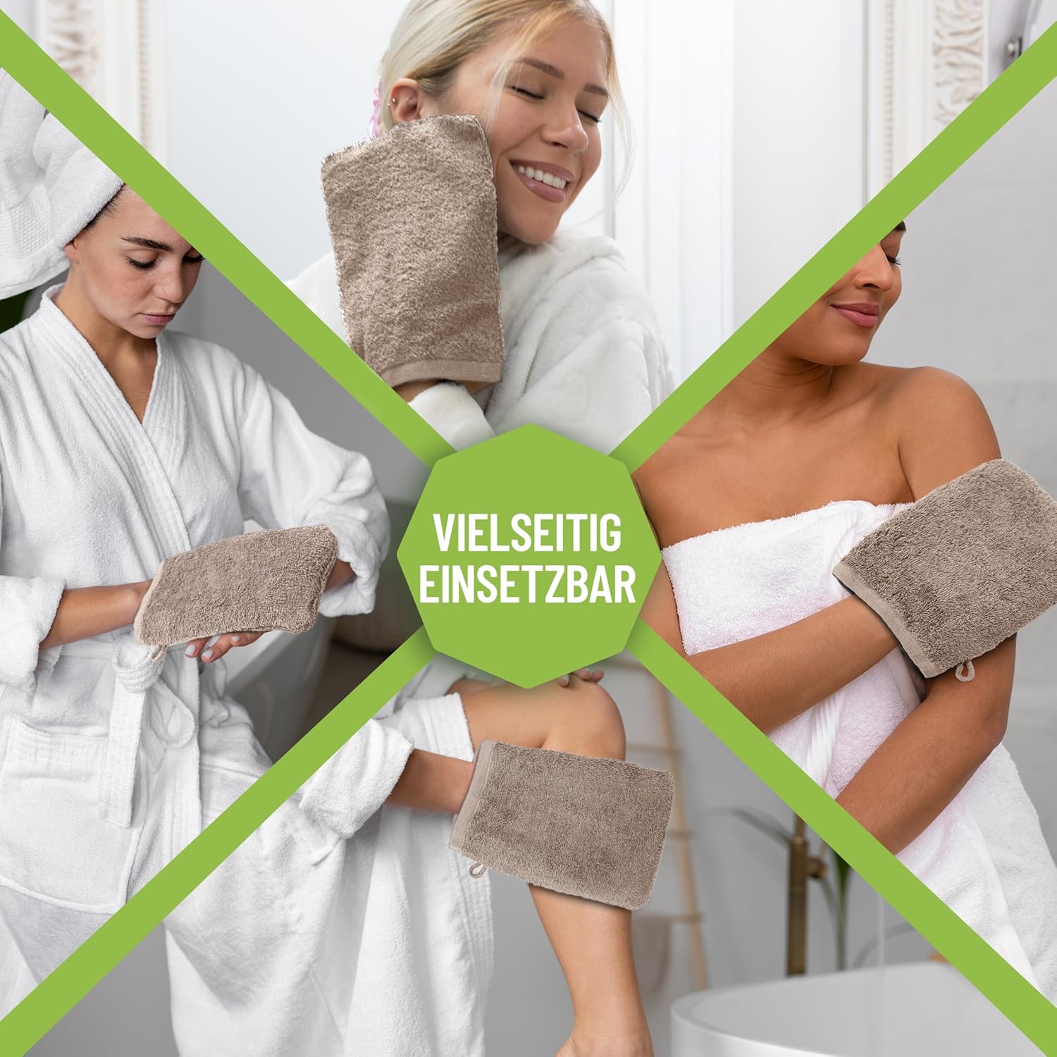 • Комплект от 10 хавлиени ръкавици за миене с примка.