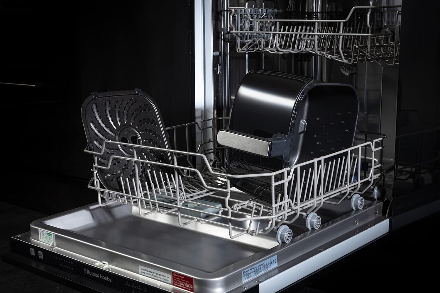 The removable, non-stick frying basket and grill plate are dishwasher safe and can be removed after each use for easy cleaning.