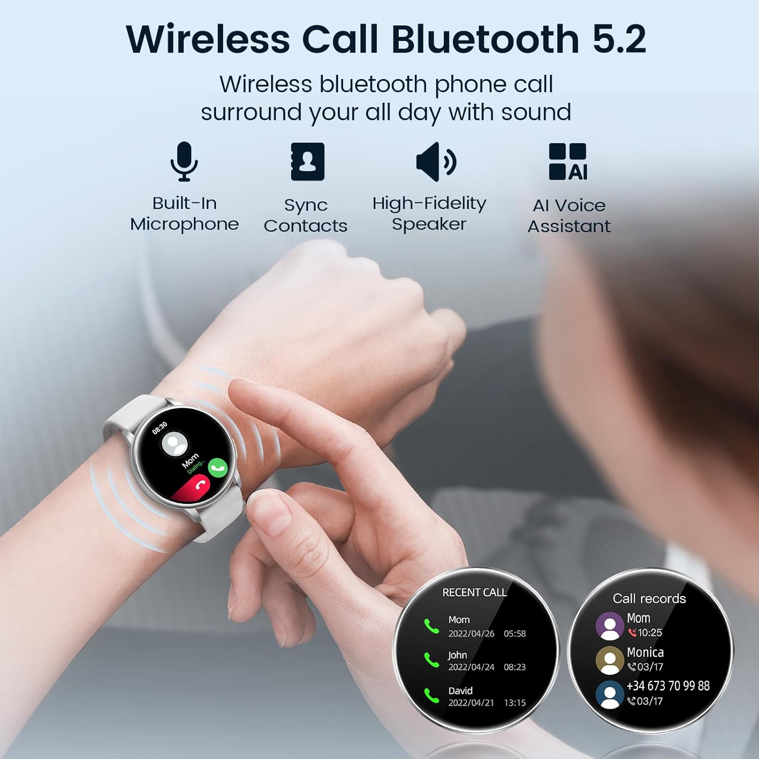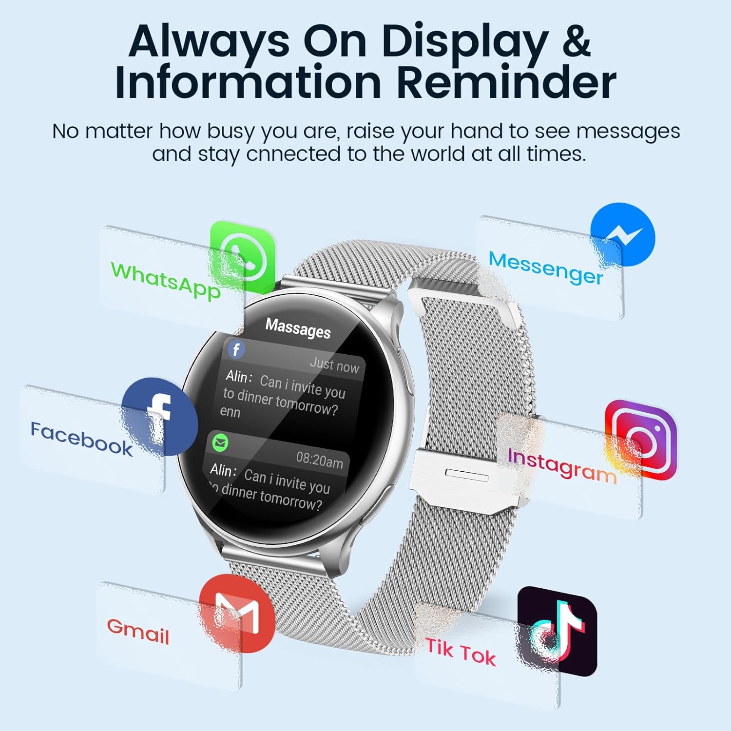 1: Call and Answer: The women's smart watch uses the latest Bluetooth 5.1 technology, the connection is fast and stable. You can choose directly on the wrist and support hands-free calling. In addition to contact sync, it also supports receiving SMS and SNS notifications (WhatsApp, Facebook, Messenger, etc.).