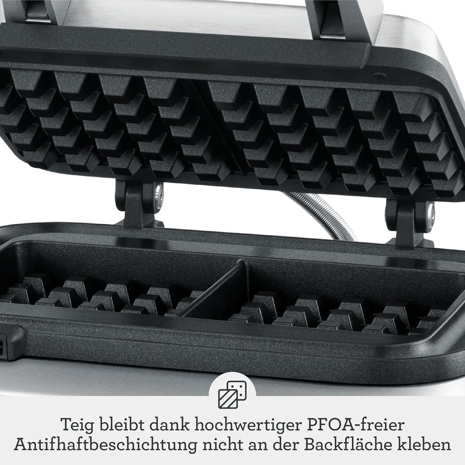 • Технологията за равномерно разпределение на топлината върху гофретите осигурява равномерна топлина за равномерно изпечени гофрети без загорели краища