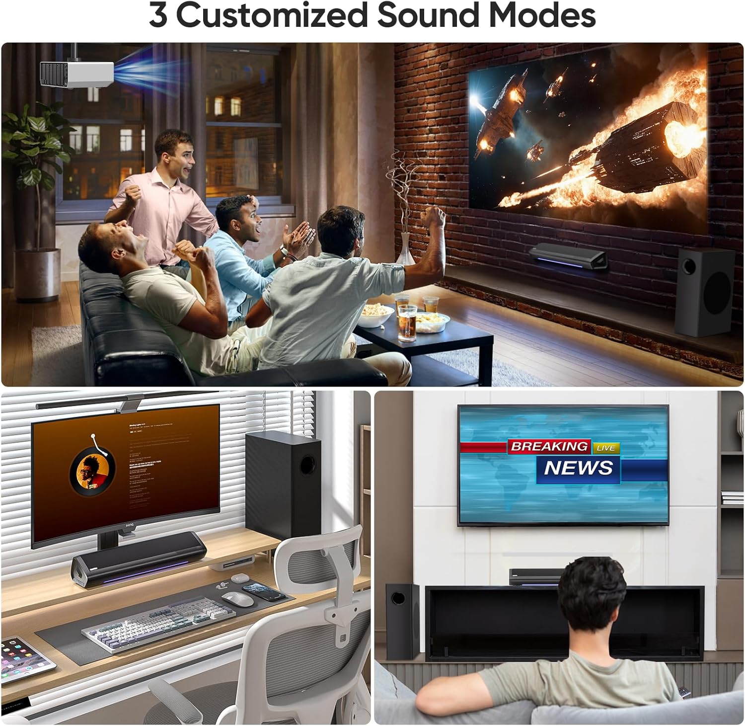 • 3 режима на еквалайзера: дистанционното управление на саундбара за телевизор има три професионални режима на еквалайзера - музика, филм и съобщения, които са съобразени с вашите различни аудио изисквания. Моля, обърнете внимание: батериите не са включени в съдържанието на кутията на дистанционното управление и трябва да се закупят отделно.