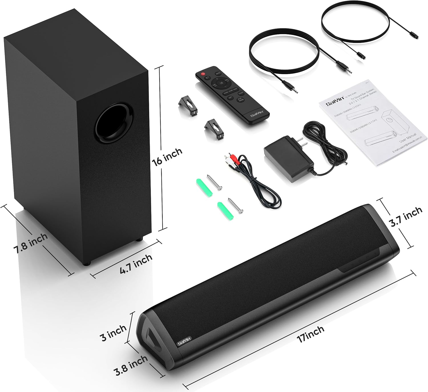 Saiyin TV саундбар със субуфер, 17-инчов саундбар за телевизионни устройства, 2.1-канална система за съраунд звук с регулируем бас, дисплей за сила на звука и Bluetooth/оптичен/AUX вход за телевизор, компютър, проектор
