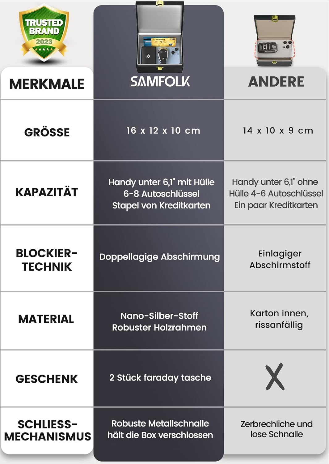 • [Пакет за големи размери за семейства] -- Уникален размер 16 x 12 x 10 см за тези, които се нуждаят от повече място в кутията за съхранение на телефони, множество ключове и ключодържатели или голям портфейл. Включва допълнителен чифт калъфчета за ключове за кола с размери 14 x 10 см за преносима употреба, осигуряващи перфектна защита за цялото семейство.