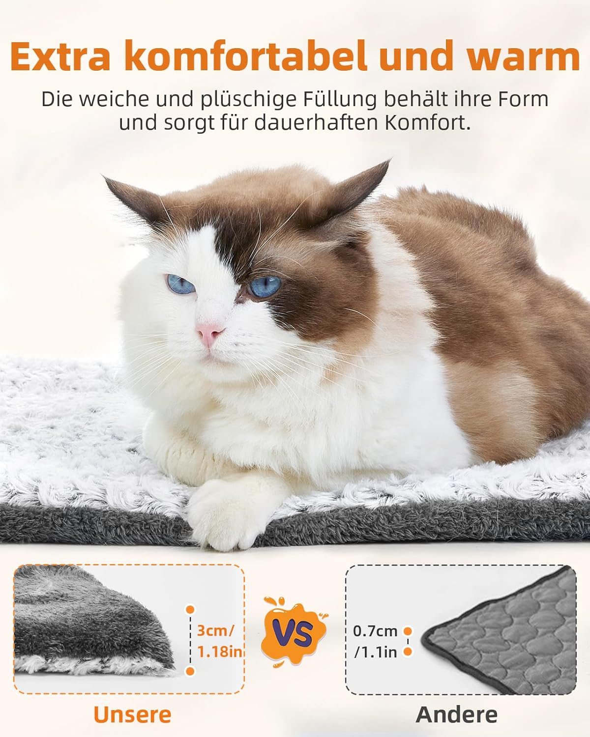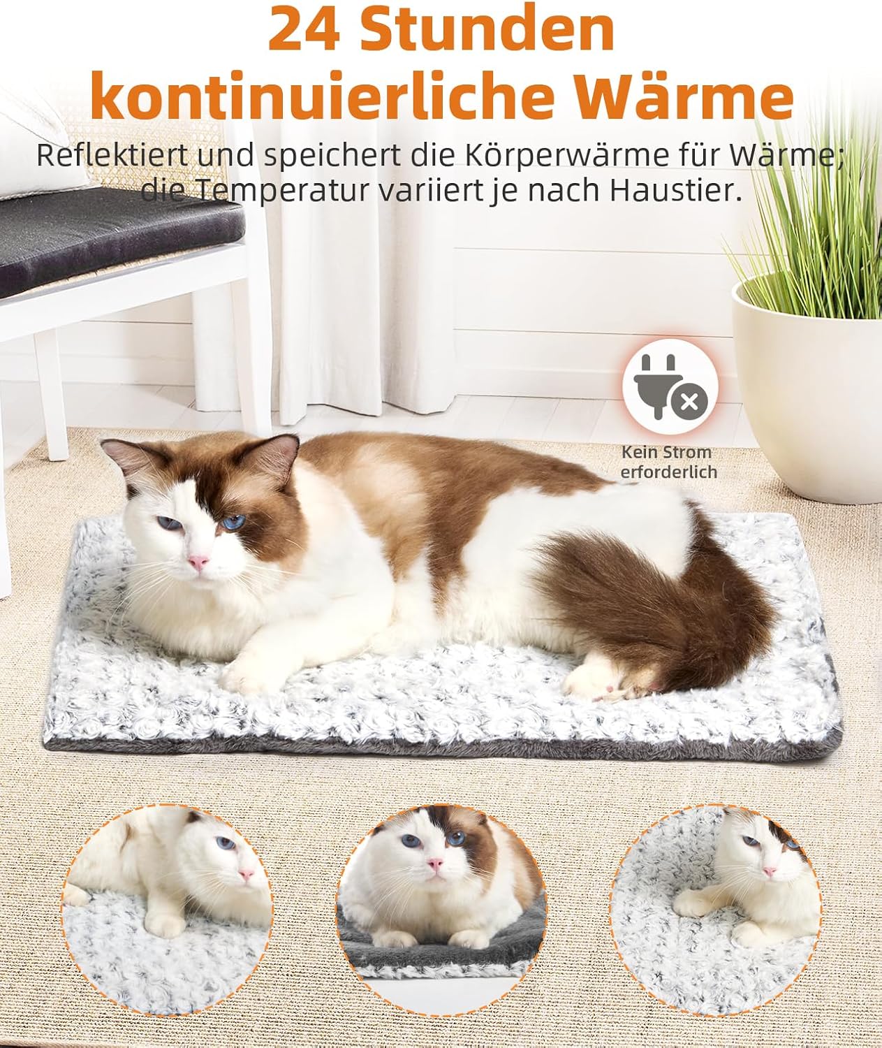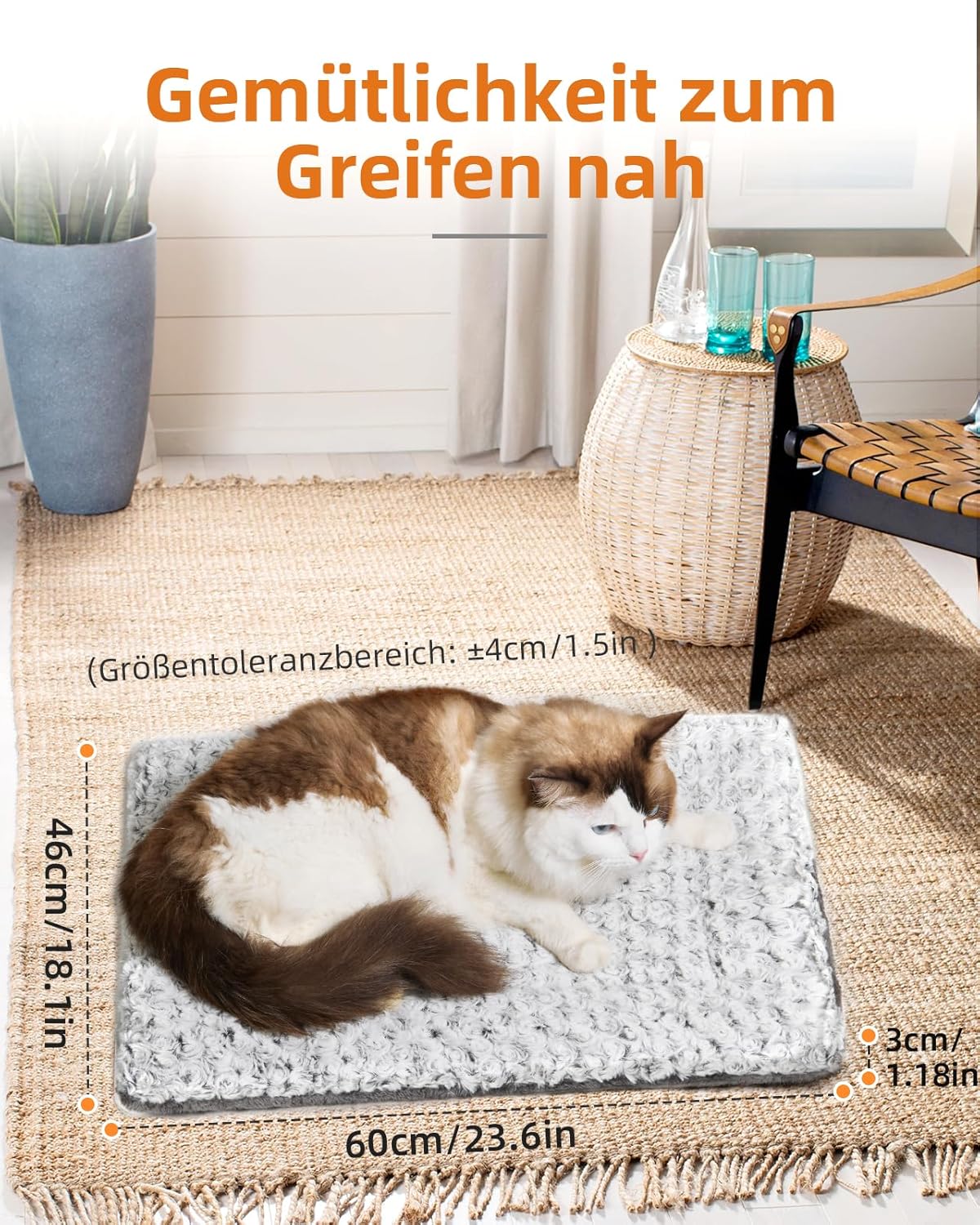 • Одеяло за котки с нагревателна подложка Самозагряващата се подложка за котки е пълна с плюшен, мек материал, който запазва формата си с течение на времето и осигурява на вашия домашен любимец дълготраен комфорт. Електрическото одеяло за котки с дължина 3 см и по-голям вътрешен пълнител, домашният любимец не е лесен за изглаждане на спонтанната нагревателна подложка, докато лежи. Гушкавият външен материал на одеялото за котки е изключително щадящ животните и осигурява на вашия домашен любимец пухкава атмосфера. Самозагряващото се одеяло остава гушливо меко дори след измиване.