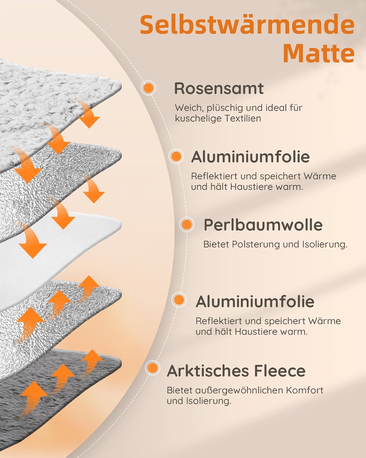 • Самозагряващо се одеяло за котки: самозагряващото се одеяло за котки има допълнителен слой от алуминиево фолио и перлен памук, което осигурява по-добро задържане на топлината в сравнение със стандартните постелки и не изисква електричество. Това самозагряващо се одеяло за котки абсорбира телесната топлина на домашния любимец и я отразява обратно към него, което го кара да се чувства топъл и уютен. Тъй като не е необходимо електричество, самозагряващото се одеяло за котки може да се постави върху стол, легло или мебели за домашни любимци. Поддържайте домашния си любимец топъл и уютен през цялата година.