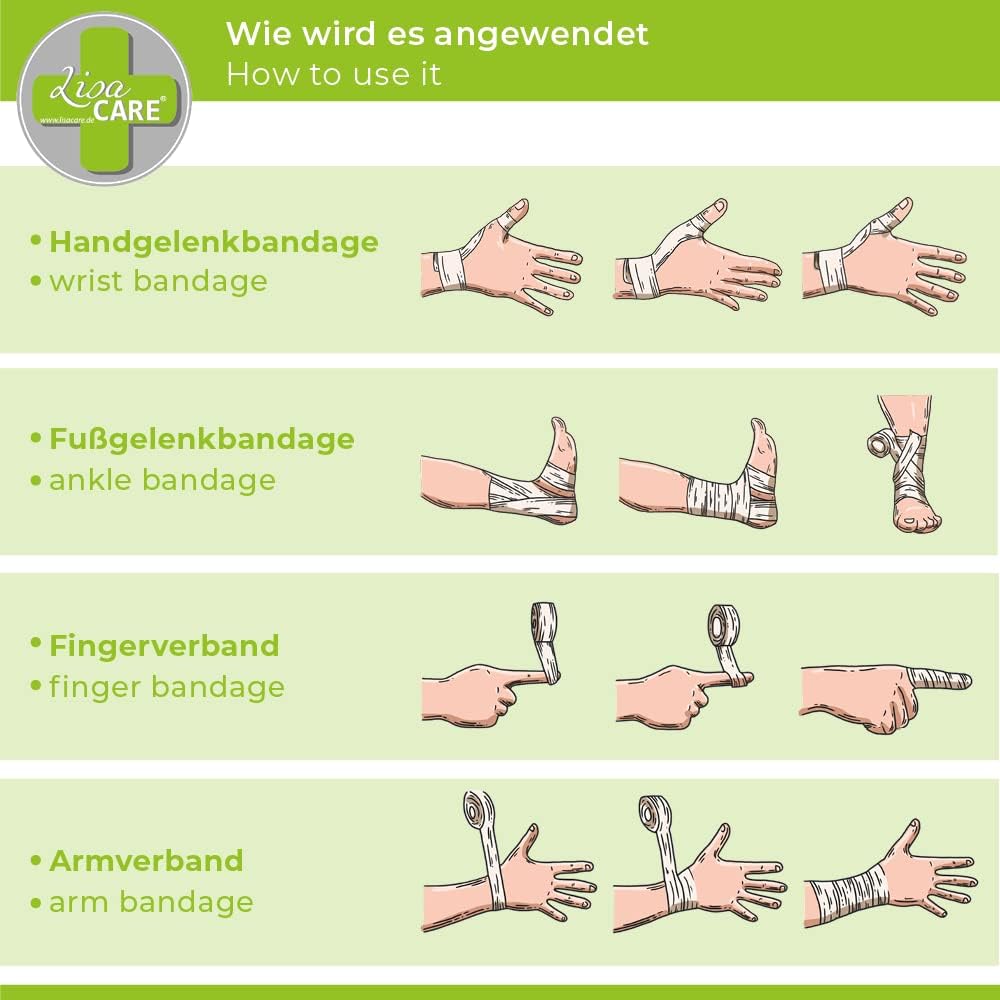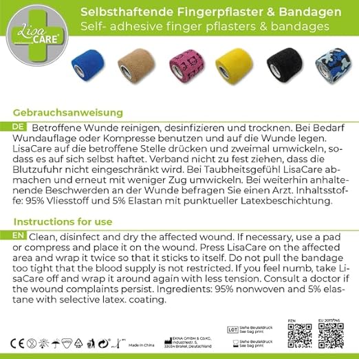 • ВОДО- И МЪРСОТЪРПИТЕЛНА - Кохезионната превръзка от LisaCare е водо-, прахо- и мръсотияотблъскваща, както и мазнини и масла, дишаща и прилепва само към себе си. - Без лепило, безболезнено отстраняване и не оставя следи. Пластирът за пръсти е също така противоплъзгащ и осигурява сигурен захват.