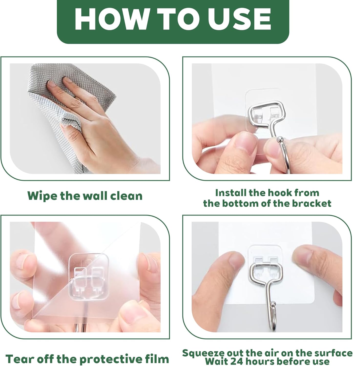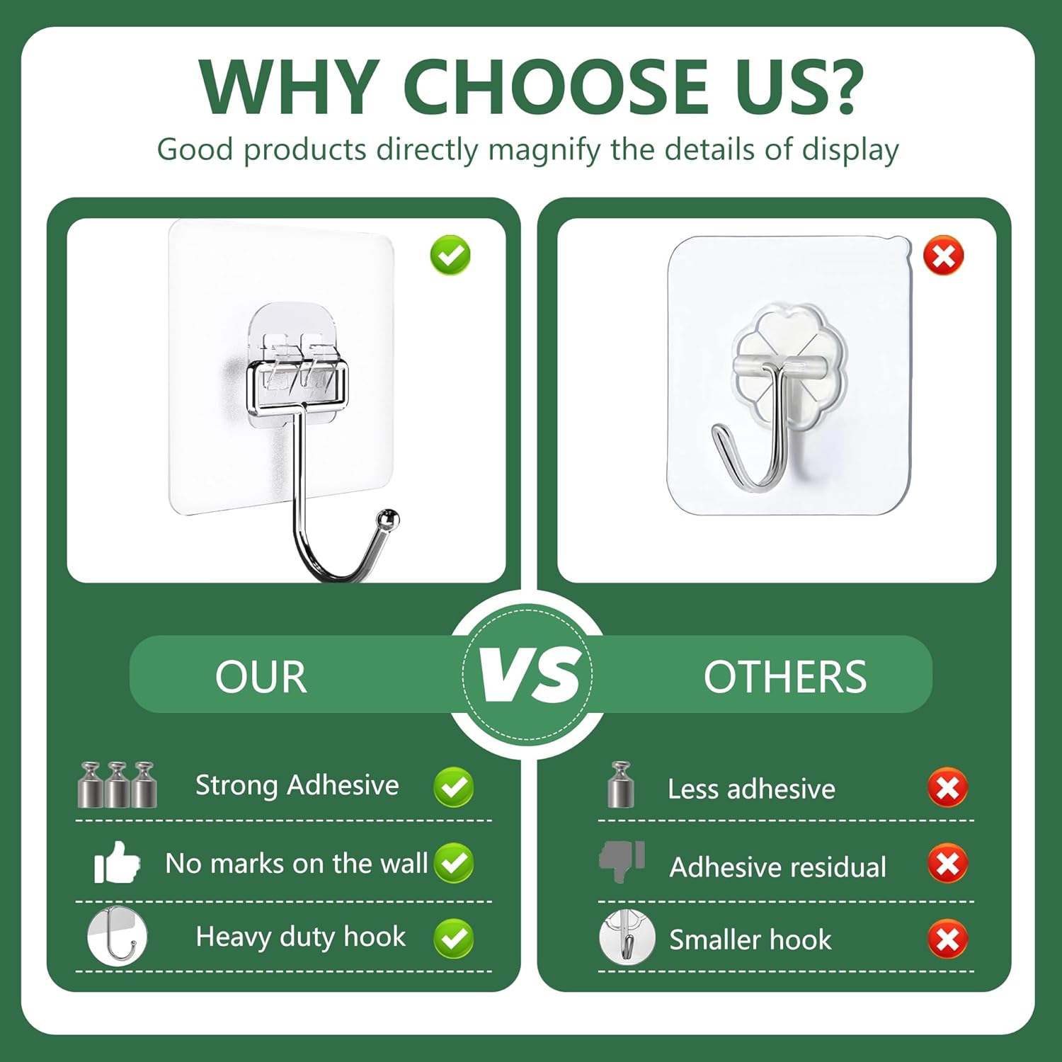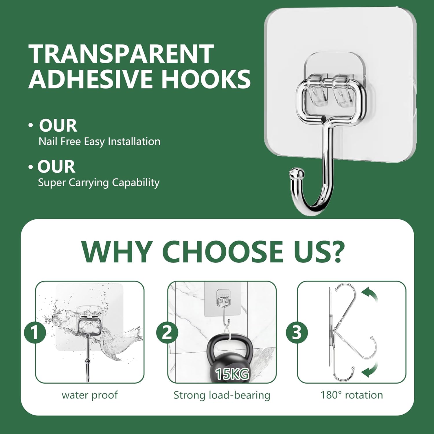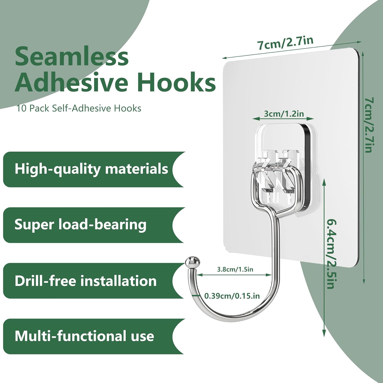 • Висококачествени материали: самозалепващите се куки са изработени от неръждаема стомана и PVC, обикновените самозалепващи се куки падат при контакт с вода. Дори при контакт с вода и масло, пръски, мокри стени, нашите безшевни самозалепващи се куки остават здрави, идеални за дългосрочна употреба.