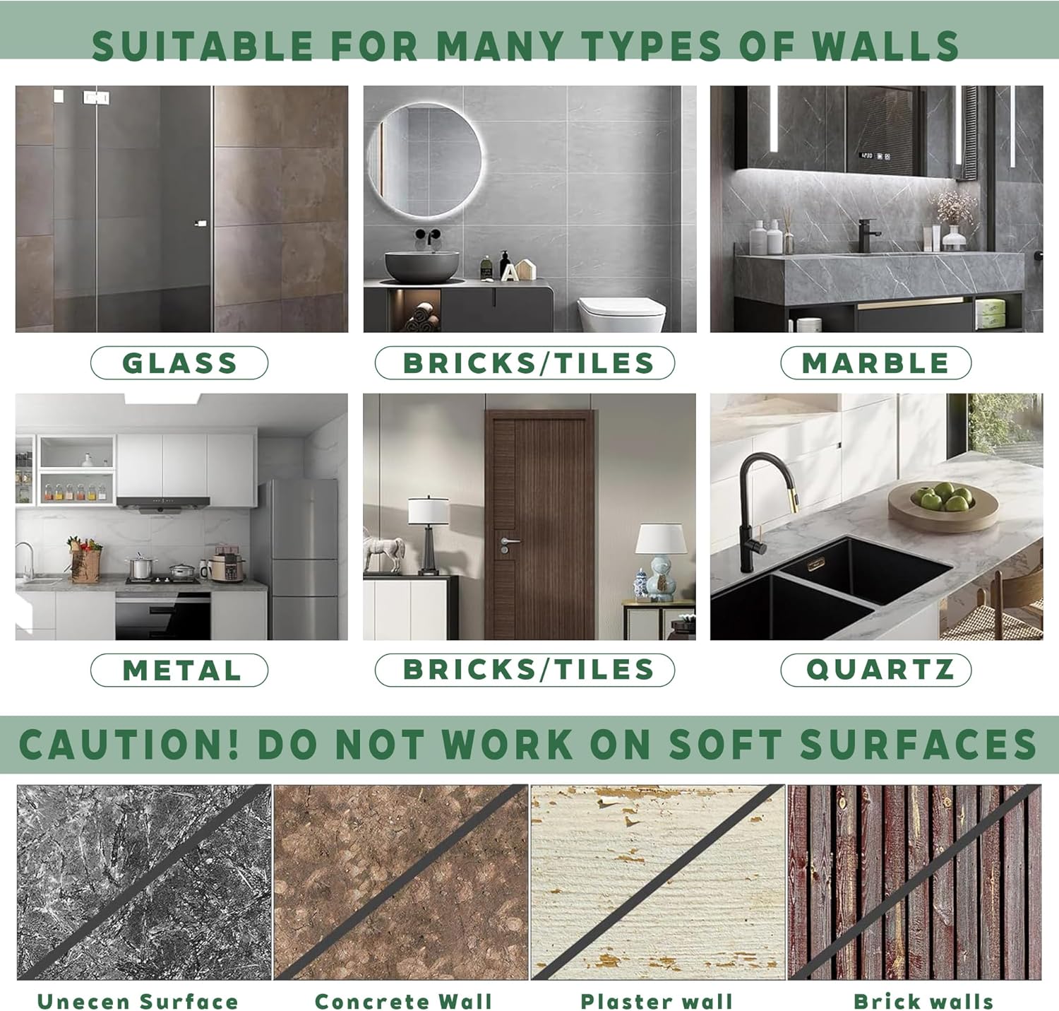 • Подходящи за различни повърхности: комплектът от 30 здрави куки се използва широко в кухнята, банята, спалнята, хола. Можете лесно да монтирате куките върху всяка гладка стена, като плочки, стъкло, метал, дървена врата, неръждаема стомана. (Но не се препоръчва за боядисване на стени и тапети).