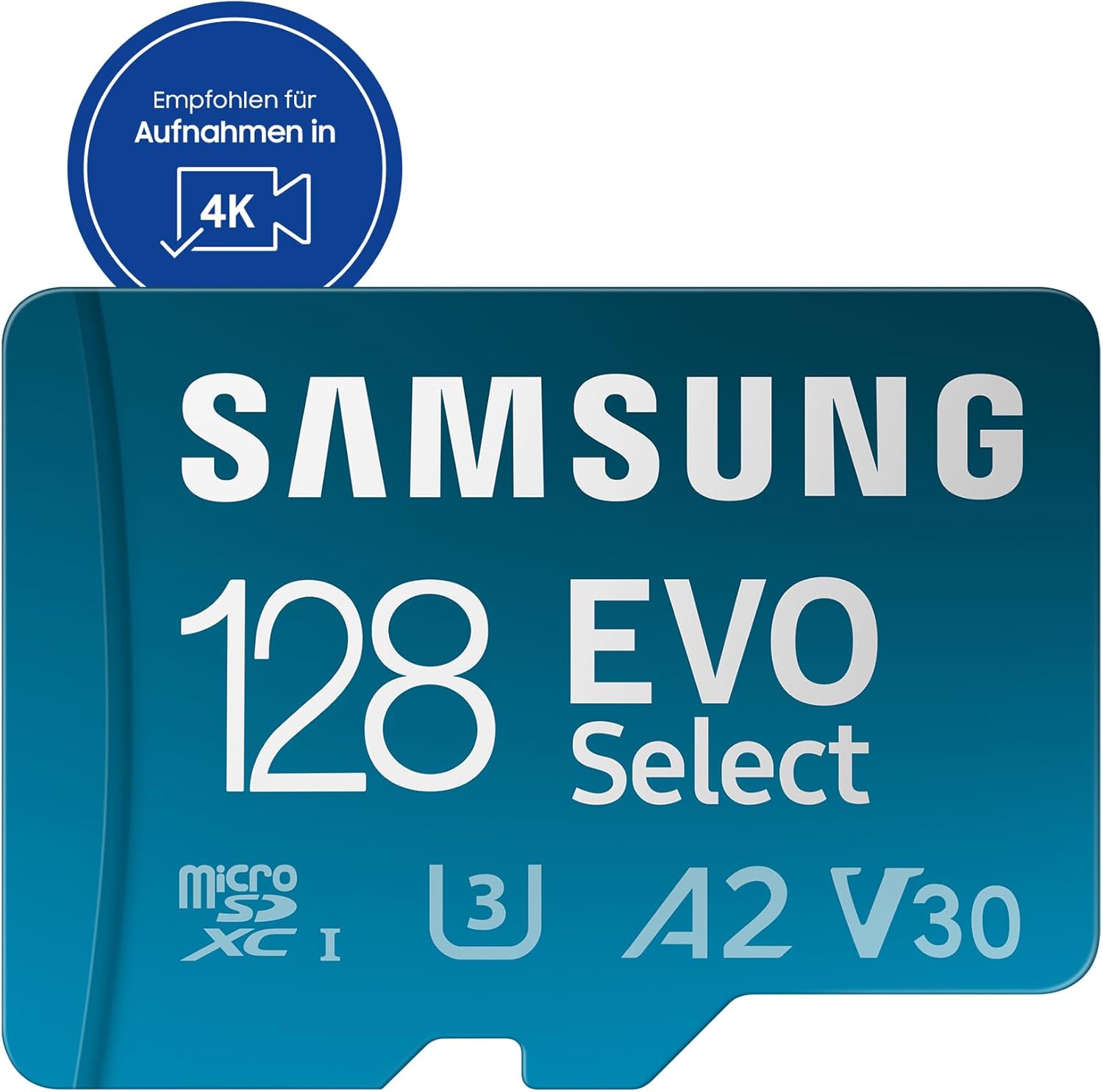 Samsung Evo Select (2024) microSD карта + SD адаптер, 128 GB, Карта памет за смартфони и таблети, UHS-I U3, 4K UHD, Full HD, 160 MB/s четене, MB-ME128SA/EU